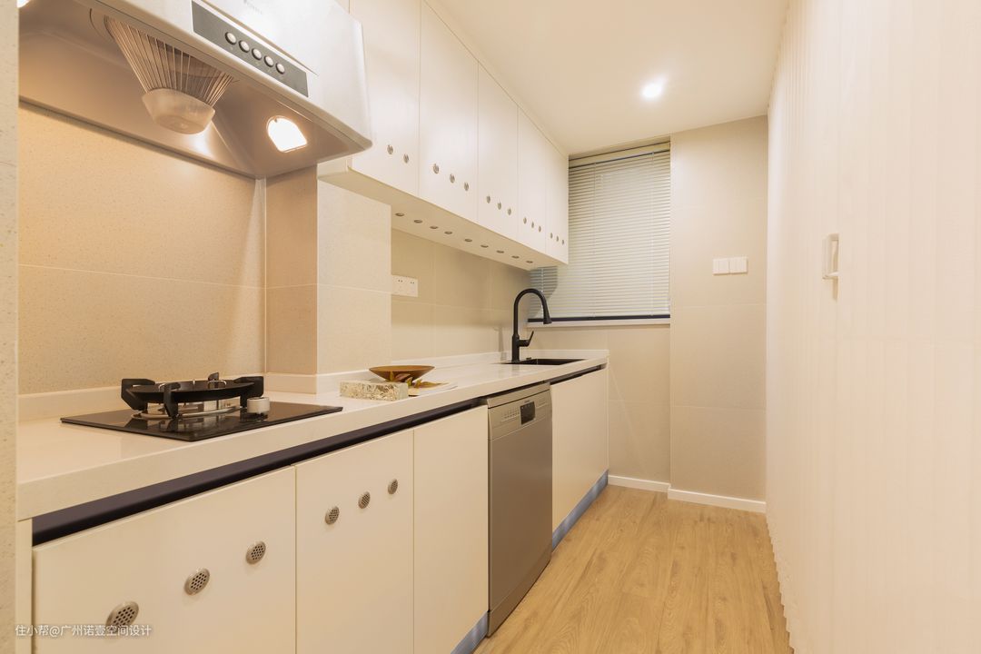 原厨房墙体拆除,整体改为开放式厨房; 整体橱柜和操作台面均为白色系,与全屋木饰面完美结合。 #厨房#吊柜#地柜