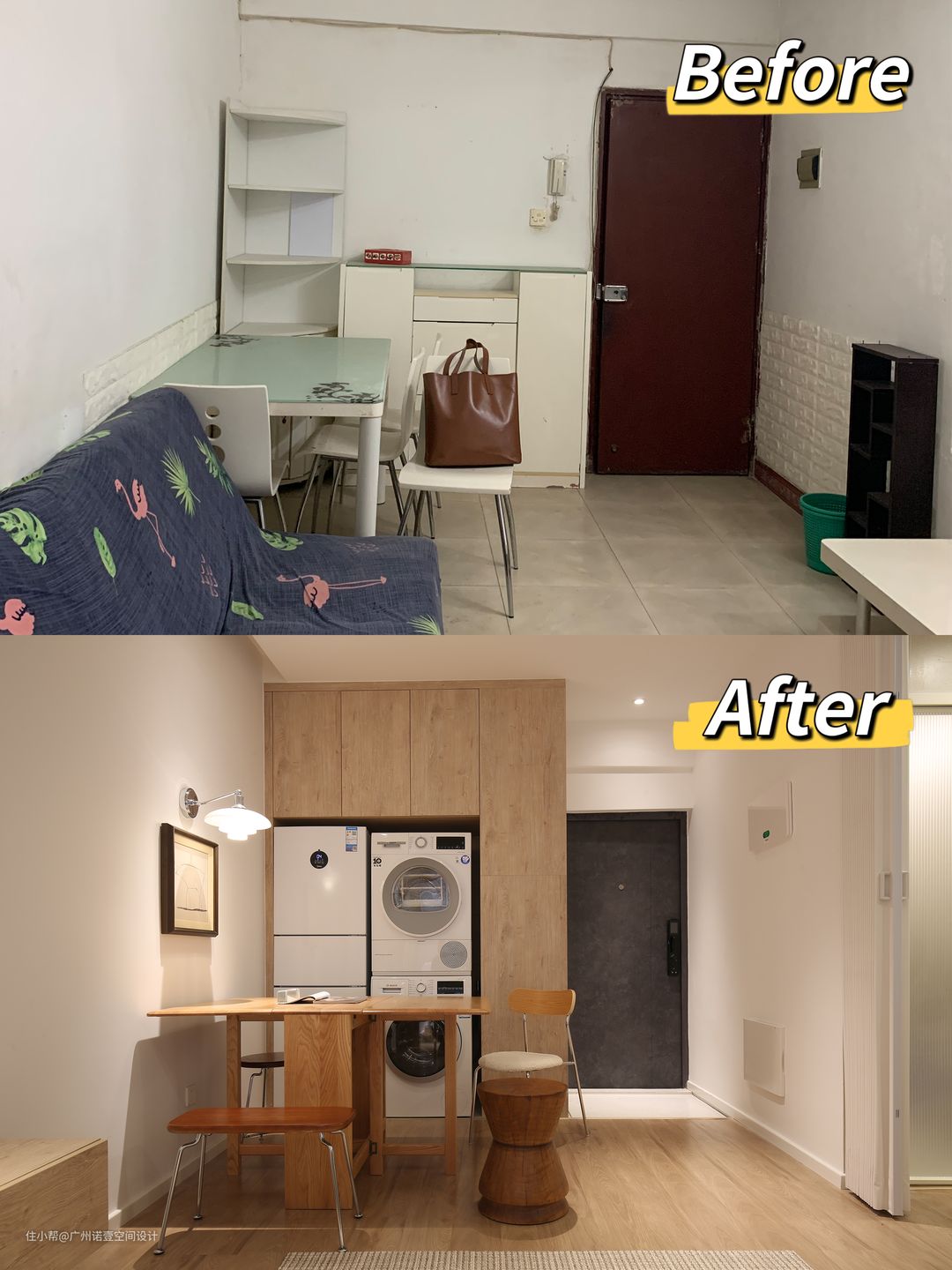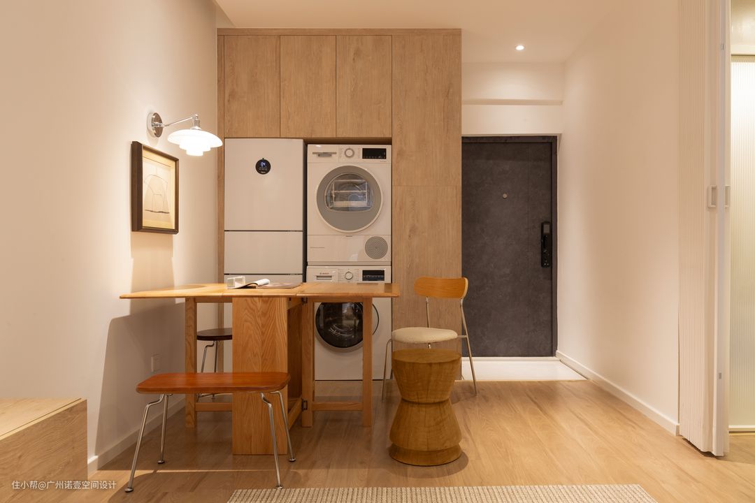 侧面加装柜体,可放置洗衣机+烘干机及冰箱; 减少冰箱的占地面积,且完美解决无阳台的烦恼。 #鞋柜#收纳柜