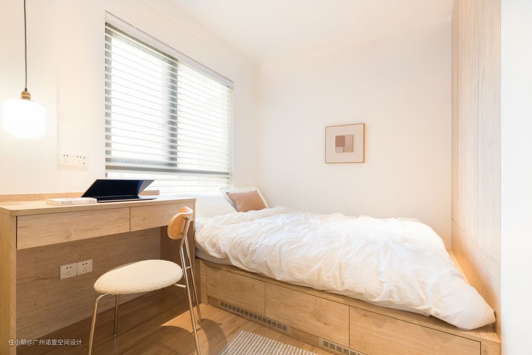 床边的书桌亦可作为床头桌使用; 窗户装香格里拉窗帘,遮阳不遮景,好看又实用。 #香格里拉窗帘#窗帘#化妆桌