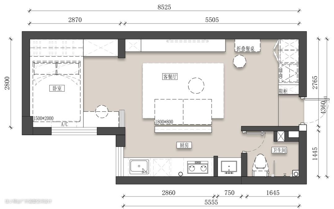优化后的平面图: 全屋原地面瓷砖拆除,除卫生间外,其余均改为木地板; 墙体做了部分修改,卧室拆除墙体,改为玻璃推拉门,过渡卧室与客厅的联系; 利用玻璃的通透性营造假象,使得整体空间看起来更大,视野更为广阔; 原厨房墙体拆除,改为开放式厨房,加装日式pvc折叠推拉门; 客厅与厨房中间加装窄吧台,可做沙发靠背亦可做临时操作台使用; 进门右侧增加鞋柜及收纳柜,满足日常收纳同时还可放置洗衣机+烘干机; 卧室改为榻榻米床,床尾安装到顶衣柜,收纳空间翻倍。