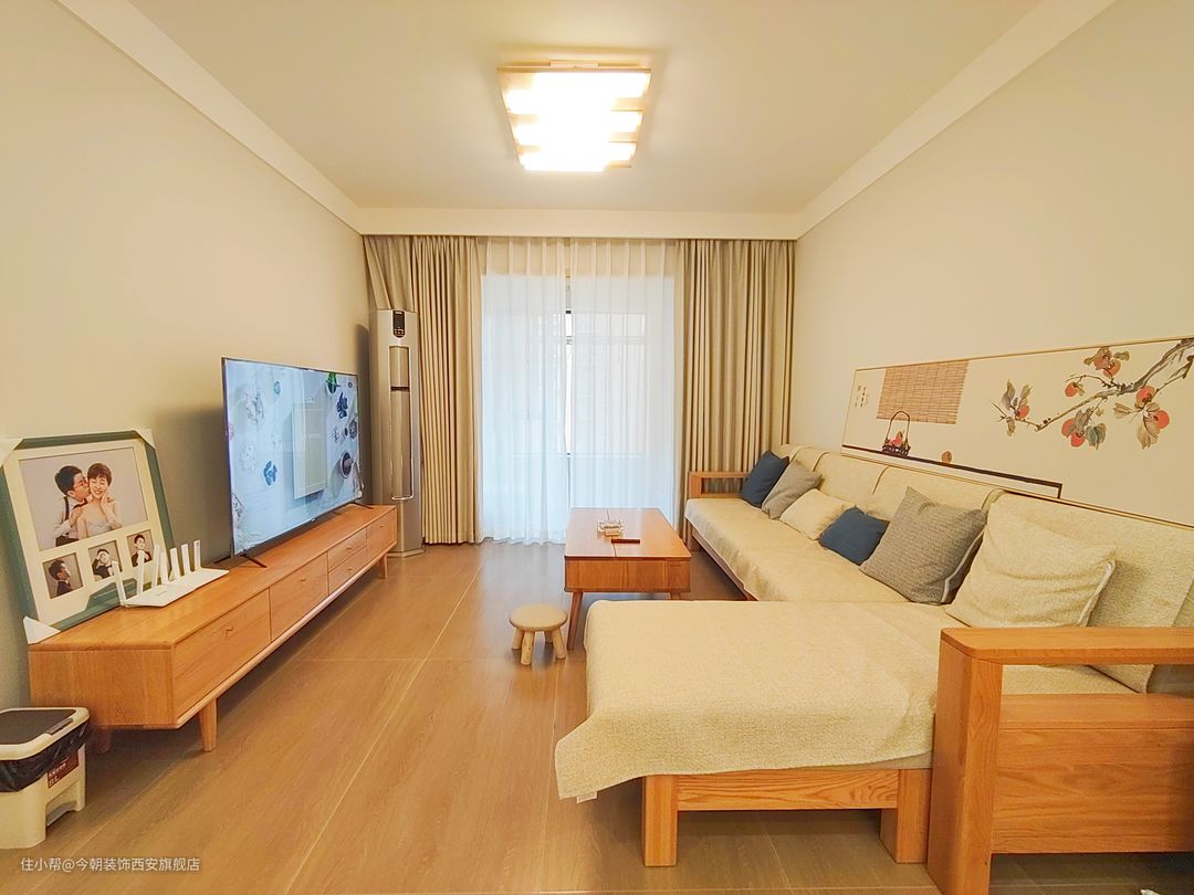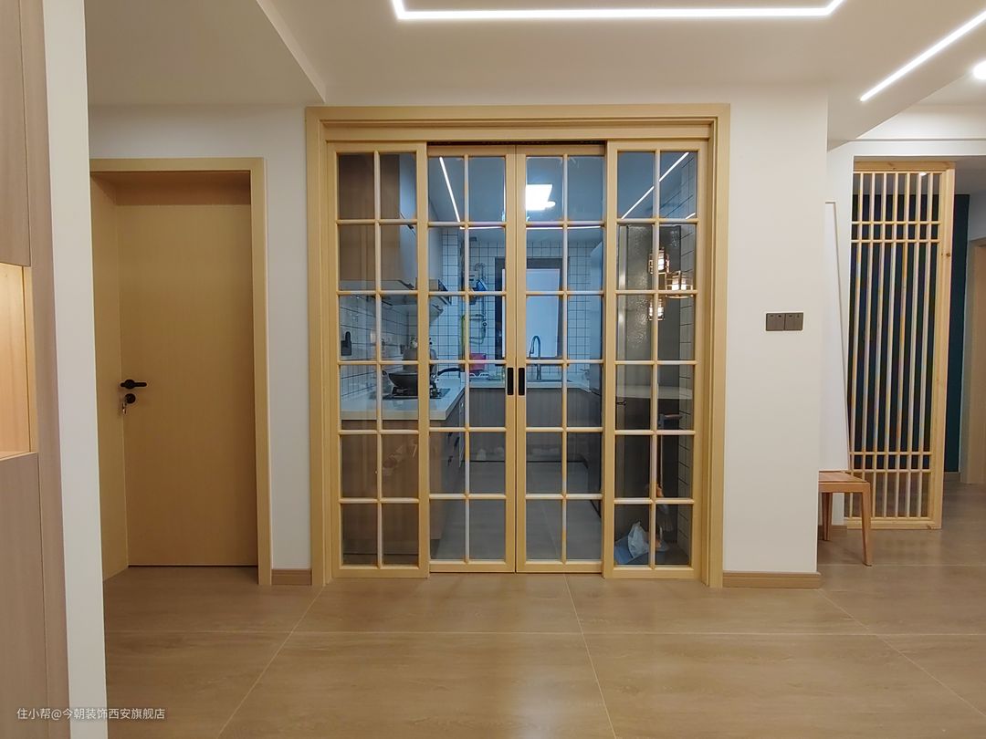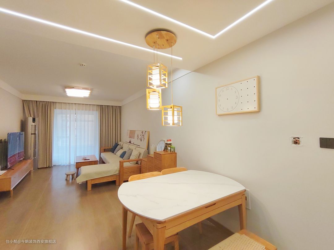 ◆装修小区:西安 · 劳动公园里 · 新房装修 ◆户型面积:115㎡三室两厅一厨一卫 ◆装修风格:日式风格 ◆设计理念:实用、适用、耐用 业主想要的: ◇喜欢轻松、温馨的氛围,家里硬装软装都要简单易打理 ◇生活动线合理,特别是厨房和卫生间高频使用的空间 ◇三口之家,有一个上小学的男孩,需要儿童房 ◇空间设计和软装搭配精巧、精简,不要太拥挤 ◇因为打算长期居住,色调要耐看,风格不易过时 设计要点: ◇整体用原木色调+白色调,简单的调色做调节,整个空间温馨但是不沉闷 ◇格局做微调,卧室不改动大的格局,细节做优化 ◇卫生间做干湿分离,做双洗漱台,避免早上使用冲突