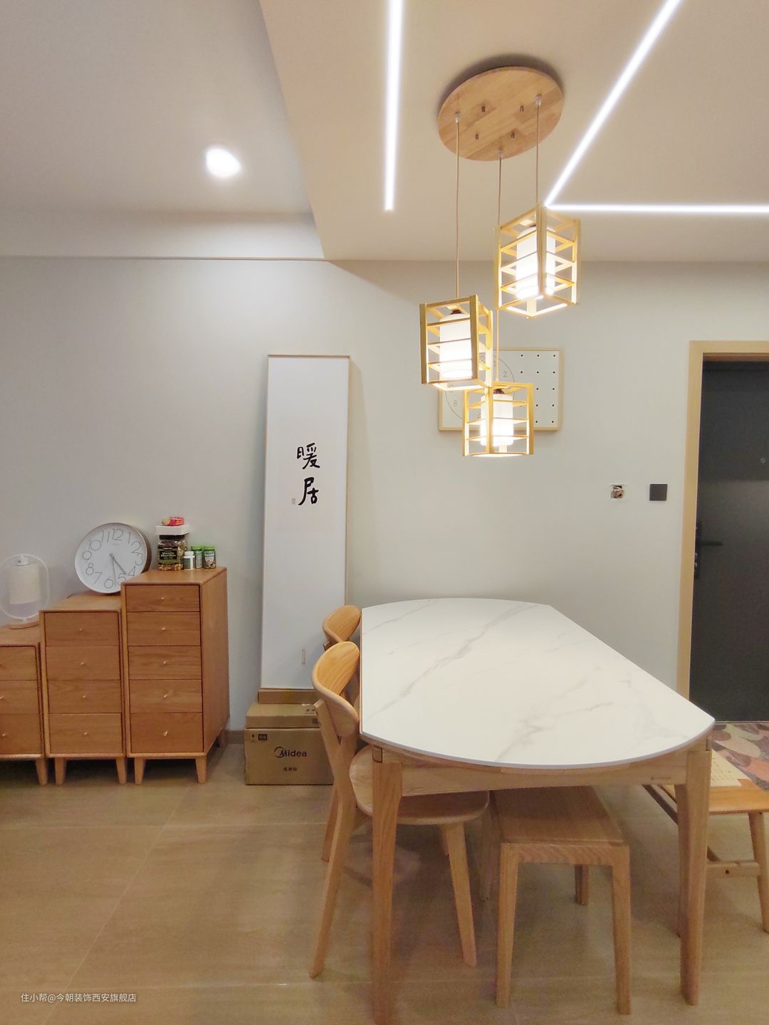 餐厅与厨房之间的空间不大,距离有限,无法实现整面墙做收纳柜的想法,把储物压力转移到了门厅收纳,餐厅的墙面只做软装挂画做点缀搭配, 避免整体空间太单调,顶部做了原木吊顶增加精致感和氛围感