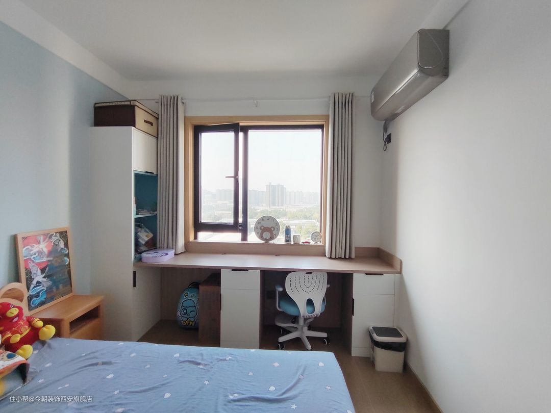 儿童房作为可能会陪伴着孩子成长十几年的空间,浅蓝色的色调能让孩子享受安静,可灵活变通的家具后期可以陪伴孩子成长也可以在孩子长大的过程中随时更换,通顶大衣柜和窗边的书桌增加了储物功能,收藏着孩子的梦