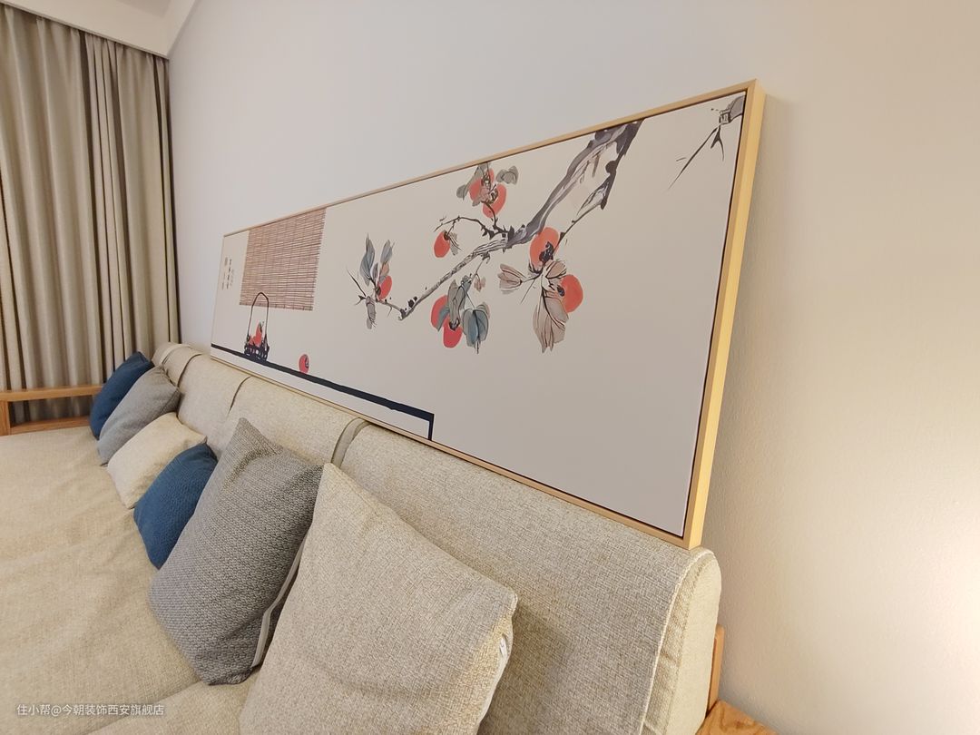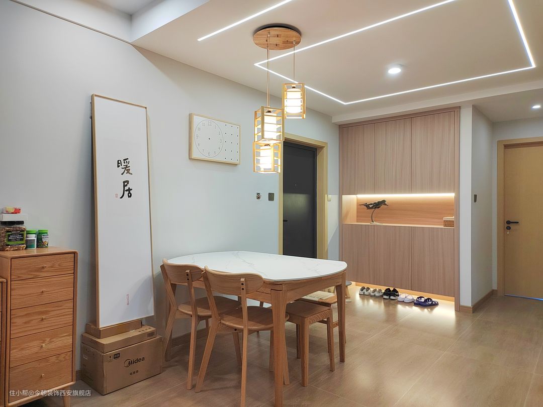 餐厅与厨房之间的空间不大,距离有限,无法实现整面墙做收纳柜的想法,把储物压力转移到了门厅收纳,餐厅的墙面只做软装挂画做点缀搭配, 避免整体空间太单调,顶部做了原木吊顶增加精致感和氛围感