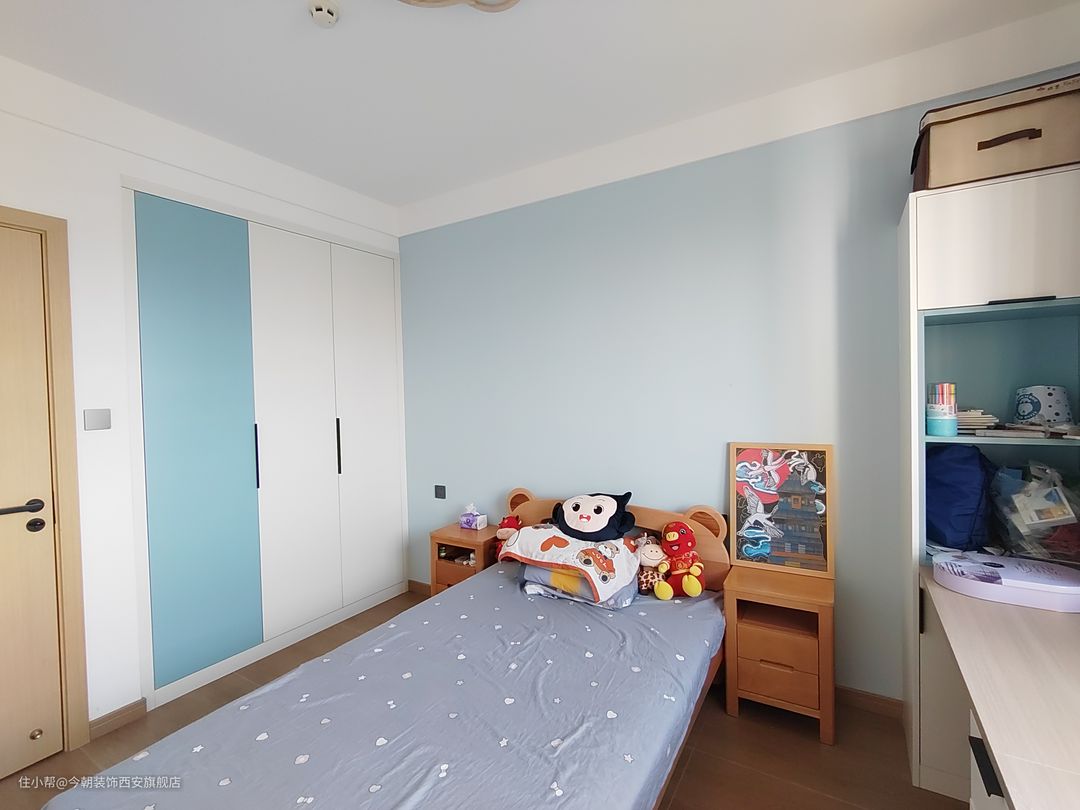 儿童房作为可能会陪伴着孩子成长十几年的空间,浅蓝色的色调能让孩子享受安静,可灵活变通的家具后期可以陪伴孩子成长也可以在孩子长大的过程中随时更换,通顶大衣柜和窗边的书桌增加了储物功能,收藏着孩子的梦