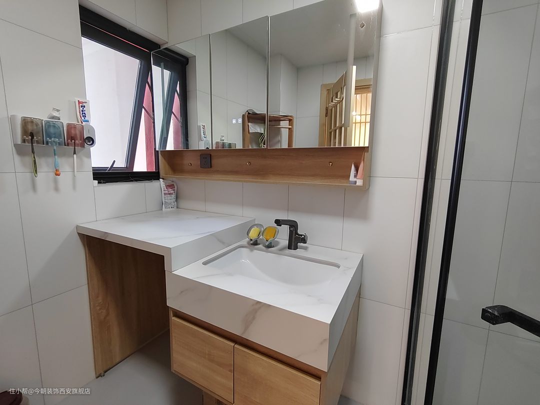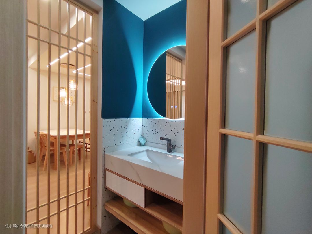 蓝色是充满活力和朝气的,也中和了原木色的单调感,成为了整个房子的点睛之笔,改动一卫的结构,设计为双面盆,避免了使用冲突的尴尬,卫生间内部做干湿分离,保证了使用方便和卫生条件,也是设计师的精巧心思了