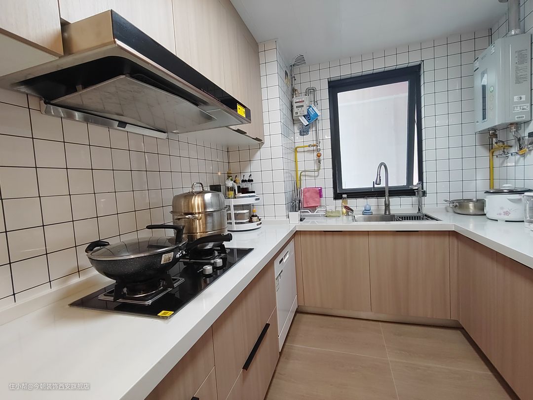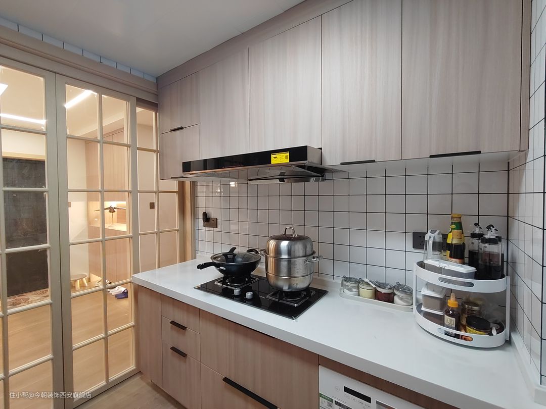 一个【梦中厨房】的标准就是易清洁、能储物、利操作,木格子的推拉门增加了厨房美观度,U型储物柜让操作更加便利,还能把冰箱镶嵌到里面,吊柜不用太多,增加了部分储物,还能把烟机隐藏起来,洗碗机肯定必不可少,解放双手的神器