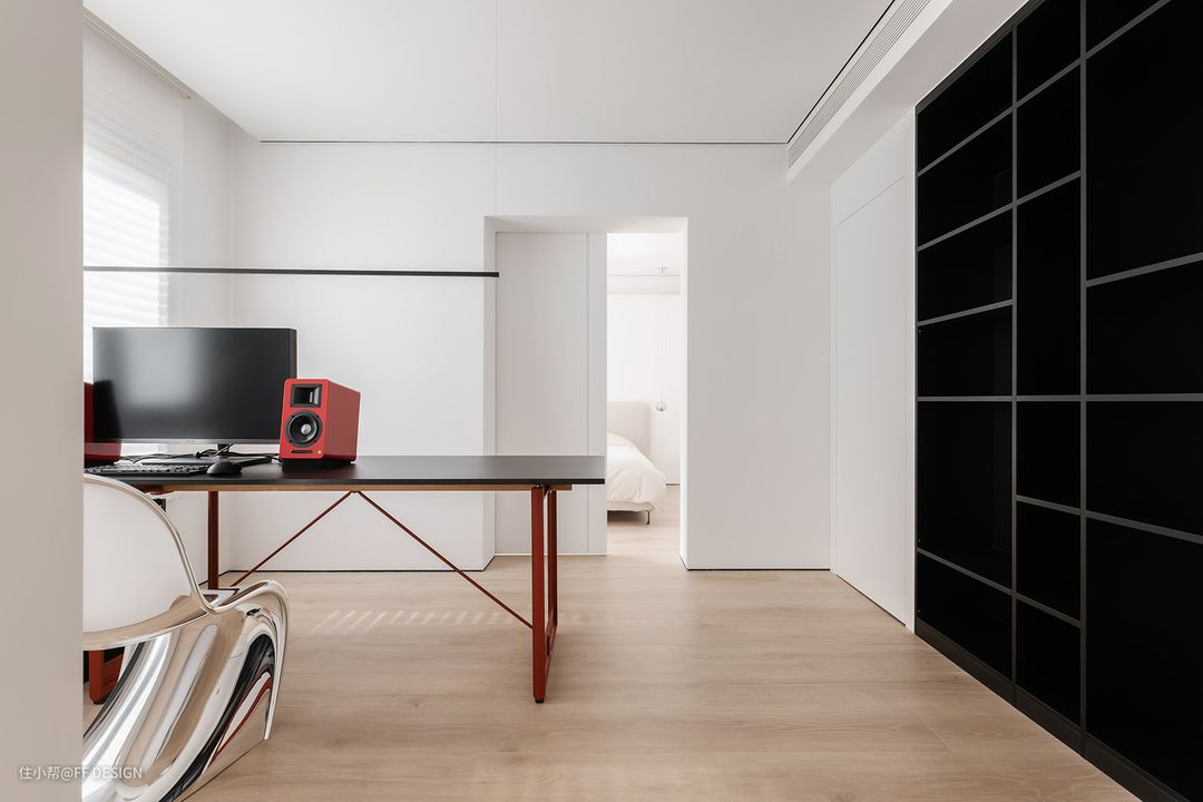 公区尽量打开,私区的开合自如,在主卧套间设置三条洄游动线(如上所示),不仅提高空间利用率,也使空间动线更为流畅。(书房在卧室的套间内) 心居之所,是为书房。简洁有力的黑色木饰面书柜,为空间增加了展示书籍和陈设物品的空间;超长的办公桌可满足夫妻俩日常的办公需求。