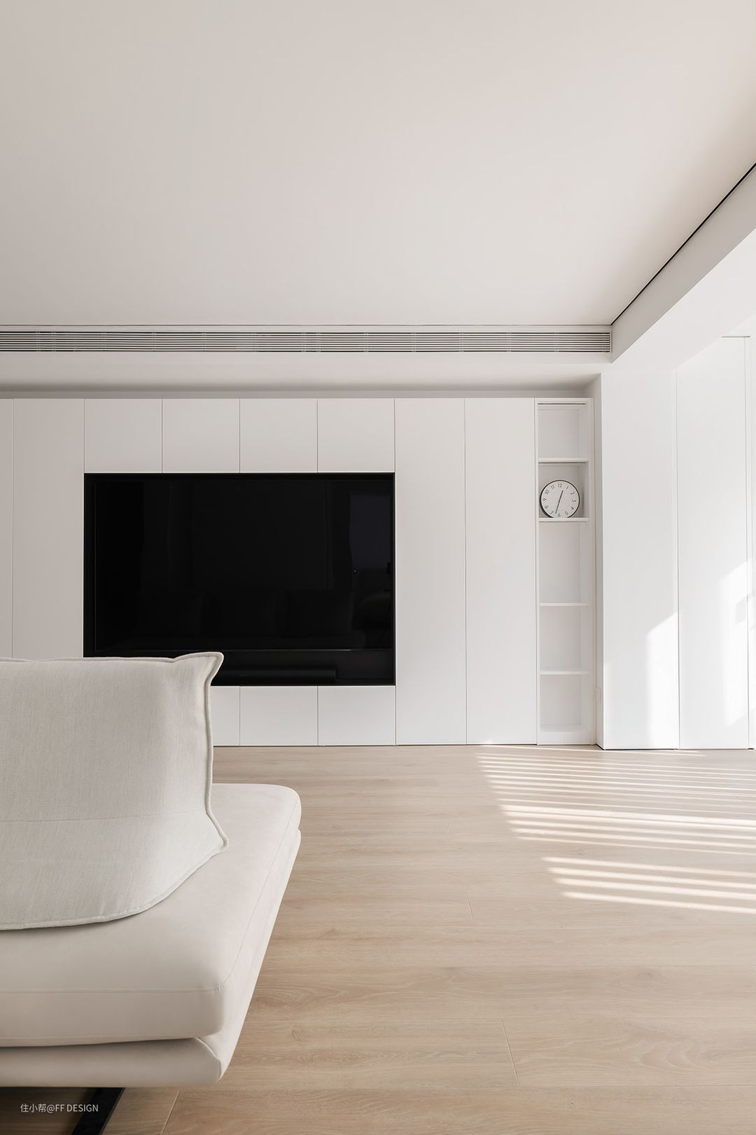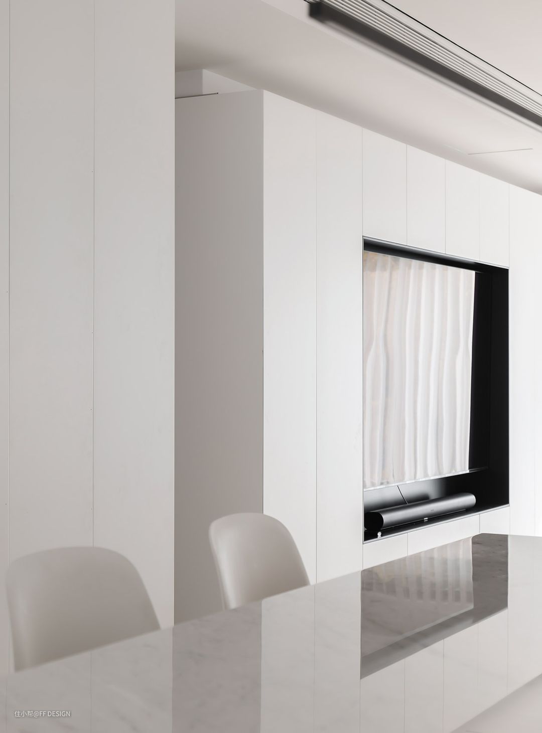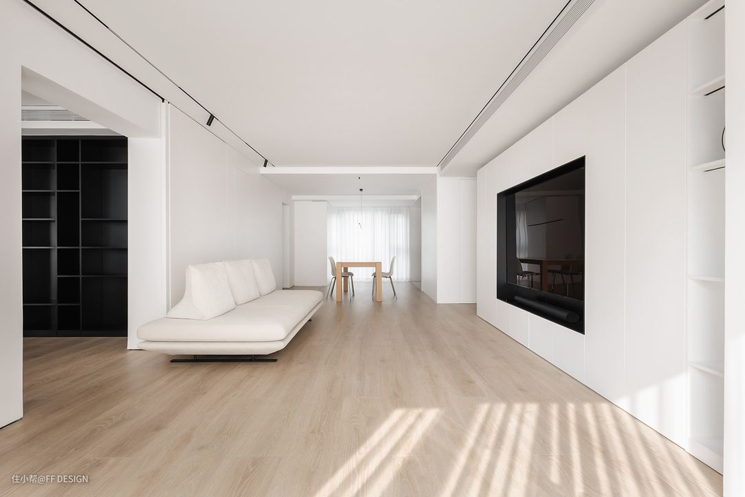 我们合作的F+全屋定制品牌做的嵌入式电视墙面开合有度,预埋电源孔位,给人一种电视“长在墙内”的错觉,与整个墙面融为一体。