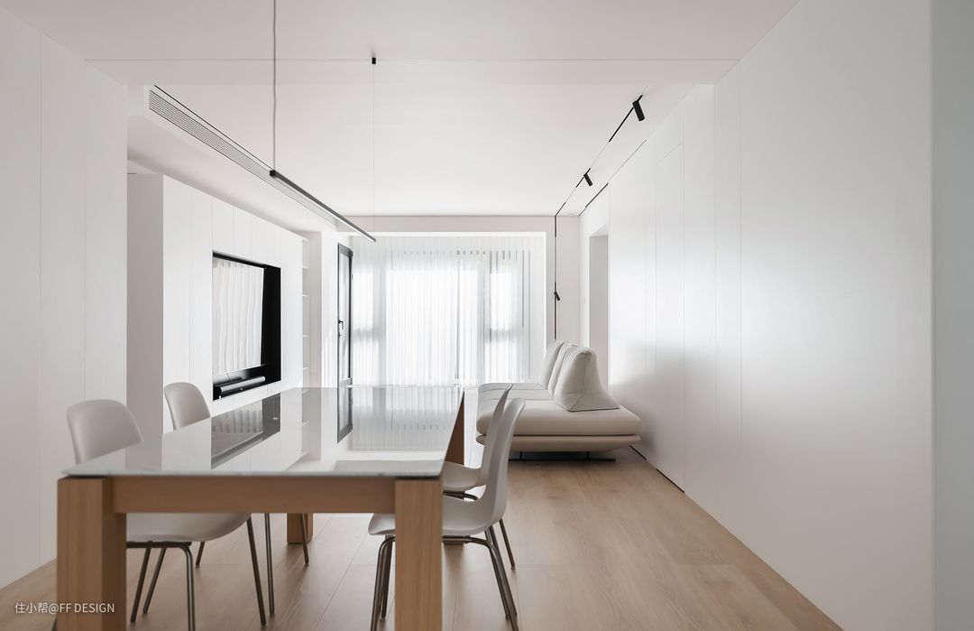 无主灯设计的吊顶干净利落,在南北超大采光面的加持下,仅用内嵌灯带和筒灯作为补充照明就已足够。 整个客餐厅做了开放式格局,中间不设任何隔断,让小星星(业主家7岁的法斗)能自在奔跑。