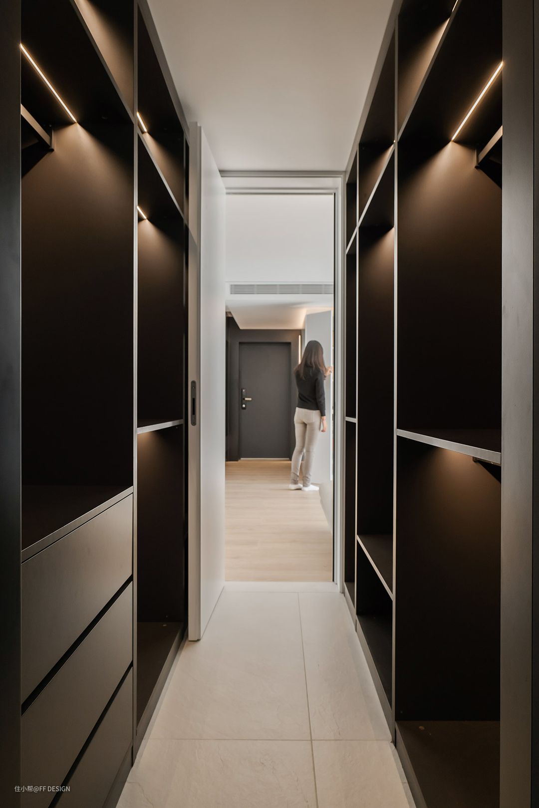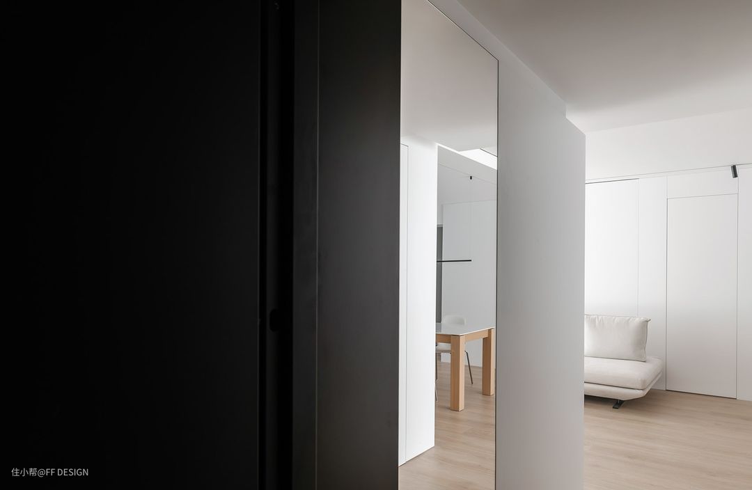 入户走廊上,左边的墙面,我们用镜面接合黑色墙面,虚实光影结合,让入户视觉更加开阔通透。