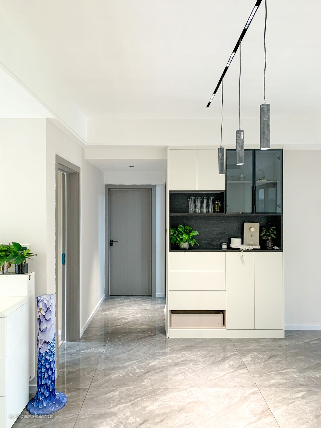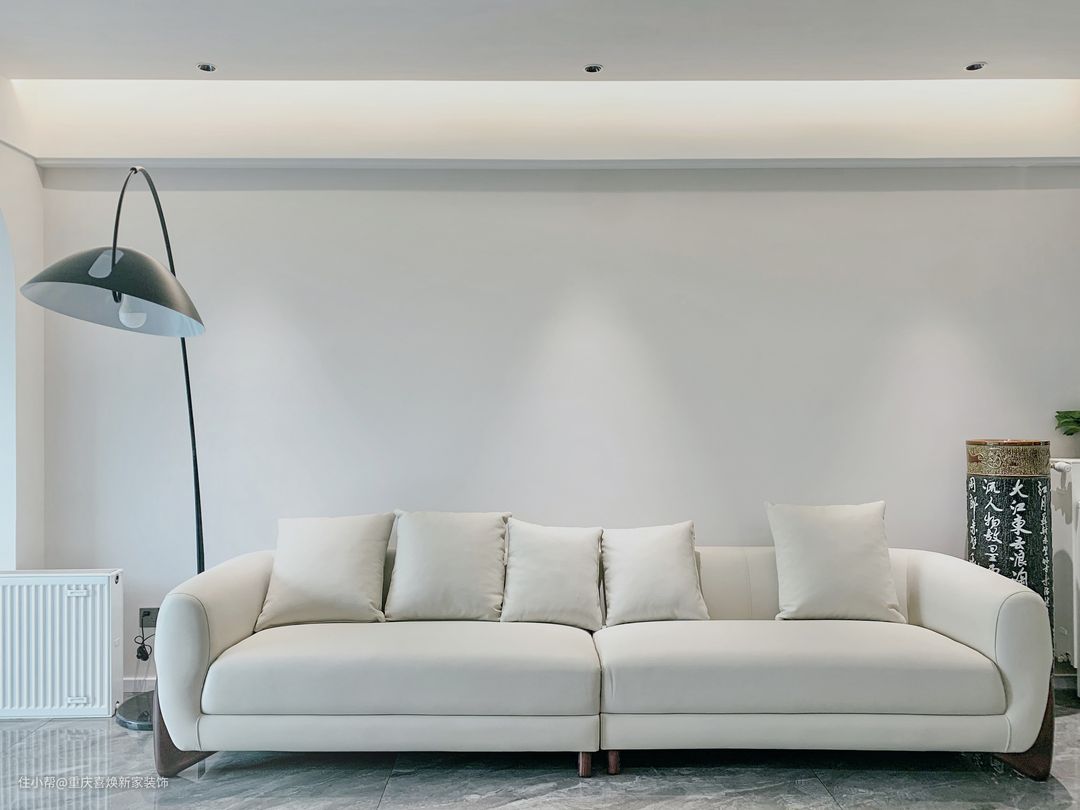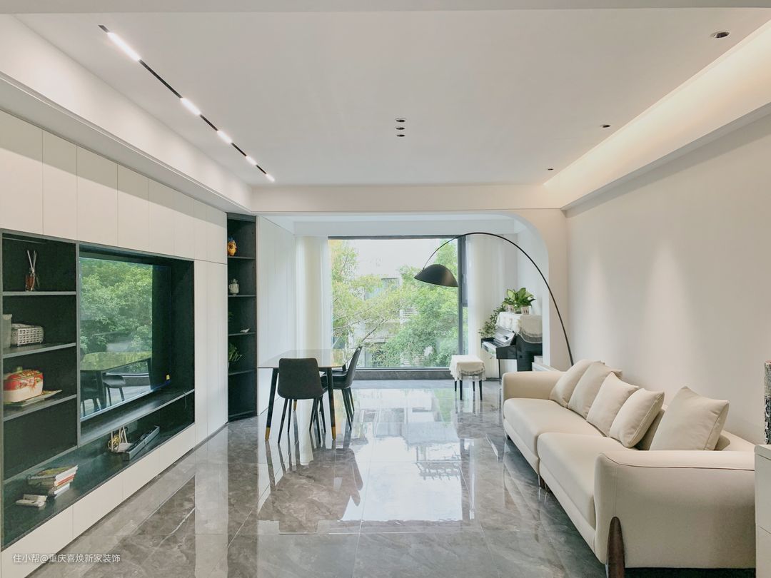 我们将客厅与阳台做拉通设计,把外阳台扩进客厅内。既增加了空间面积,也拉大了空间纵深感。同时,大面积落地窗可以充分欣赏室外绿化风景,视觉上舒适度提升。 墙面和定制柜子整体以白色为主色调,让空间更显干净通透。地面通铺灰色大理石瓷砖,与白色形成映衬。 为了保证客厅有充足的储物空间,整个电视背景墙位置做了整排的定制柜,并分别做了开放式和柜体式格局,满足业主日常生活的各种存放需求。并都是采用按压式柜门,好看又简洁。 顶部也是采用当下流行的无主灯设计,拉高层高,空间纵深度增加。再搭配反光式灯槽,明亮而不刺眼,柔和又温暖。