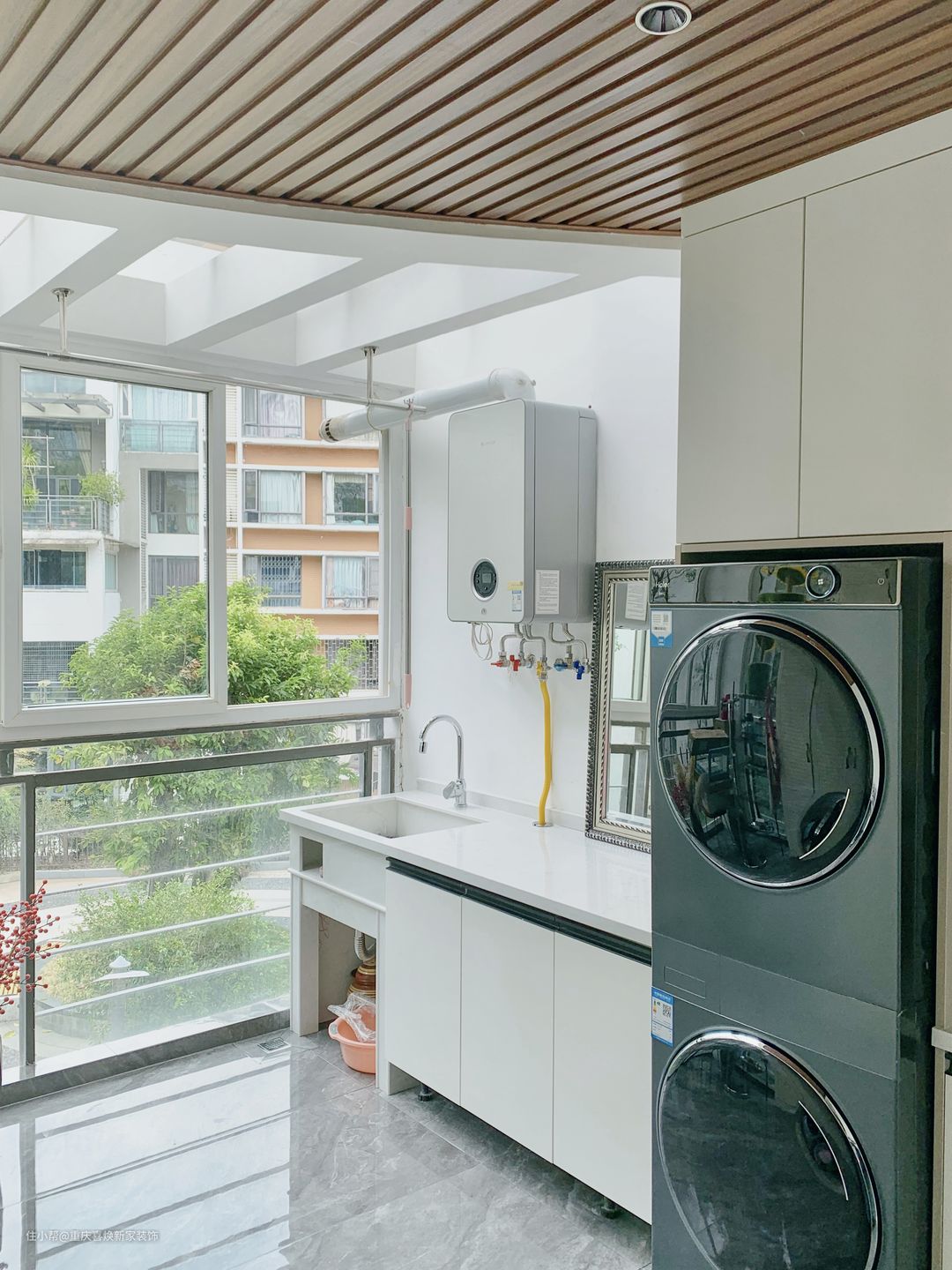 生活阳台集洗衣槽、洗烘一体机、电器于一体,将空间最大利用化。并用玻璃进行封窗设计,一定程度上避免灰尘堆积在地面,不好清理。 储物柜距离地面一定距离,一定程度上保护木质柜体,延长寿命。