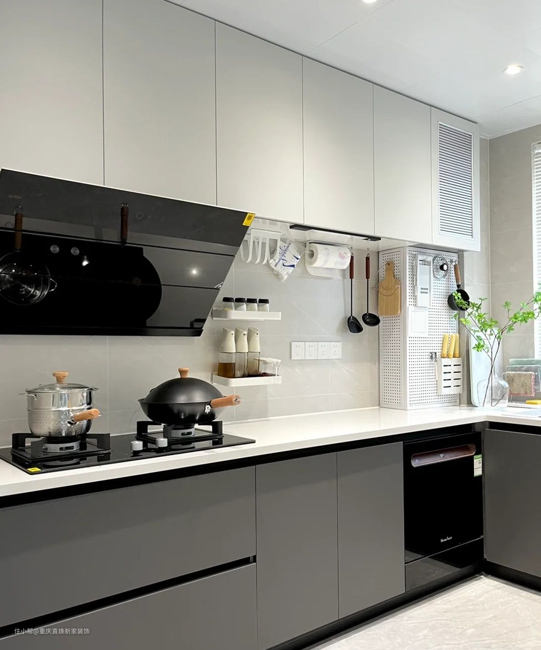 厨房是家里面最易乱,也最常用的位置,所以它的整个设计都比较简洁利落,兼具实用性和美观性。 厨房呈L状,把空间位置最大利用化,洗-切-炒三者合理分配,方便烹饪者烹饪美食,且合适的距离也让空间变得干净整洁,不会给人拥挤的感觉。 吊柜、地柜选择的是乳白色和灰色的一个上下搭配,让空间形成视觉差,增加空间层次感。并且都是无把手设计,形成一种统一的美感,开关也更加方便便捷,也不会出现把手生锈现象。