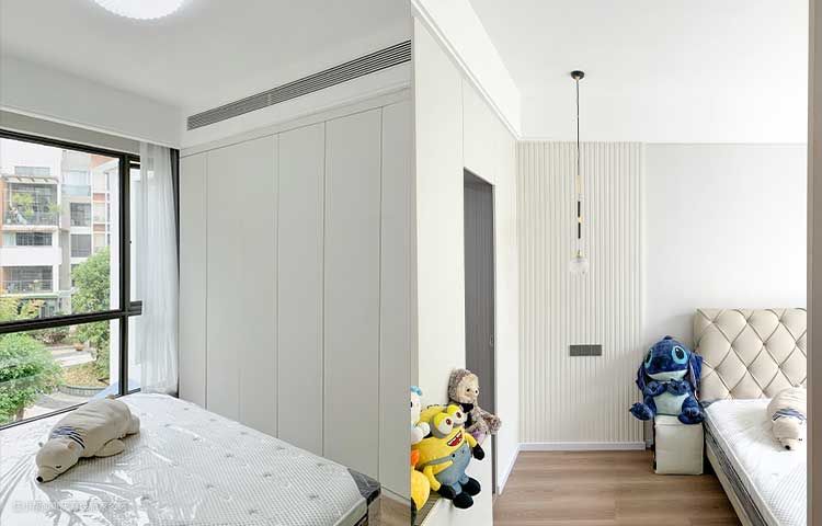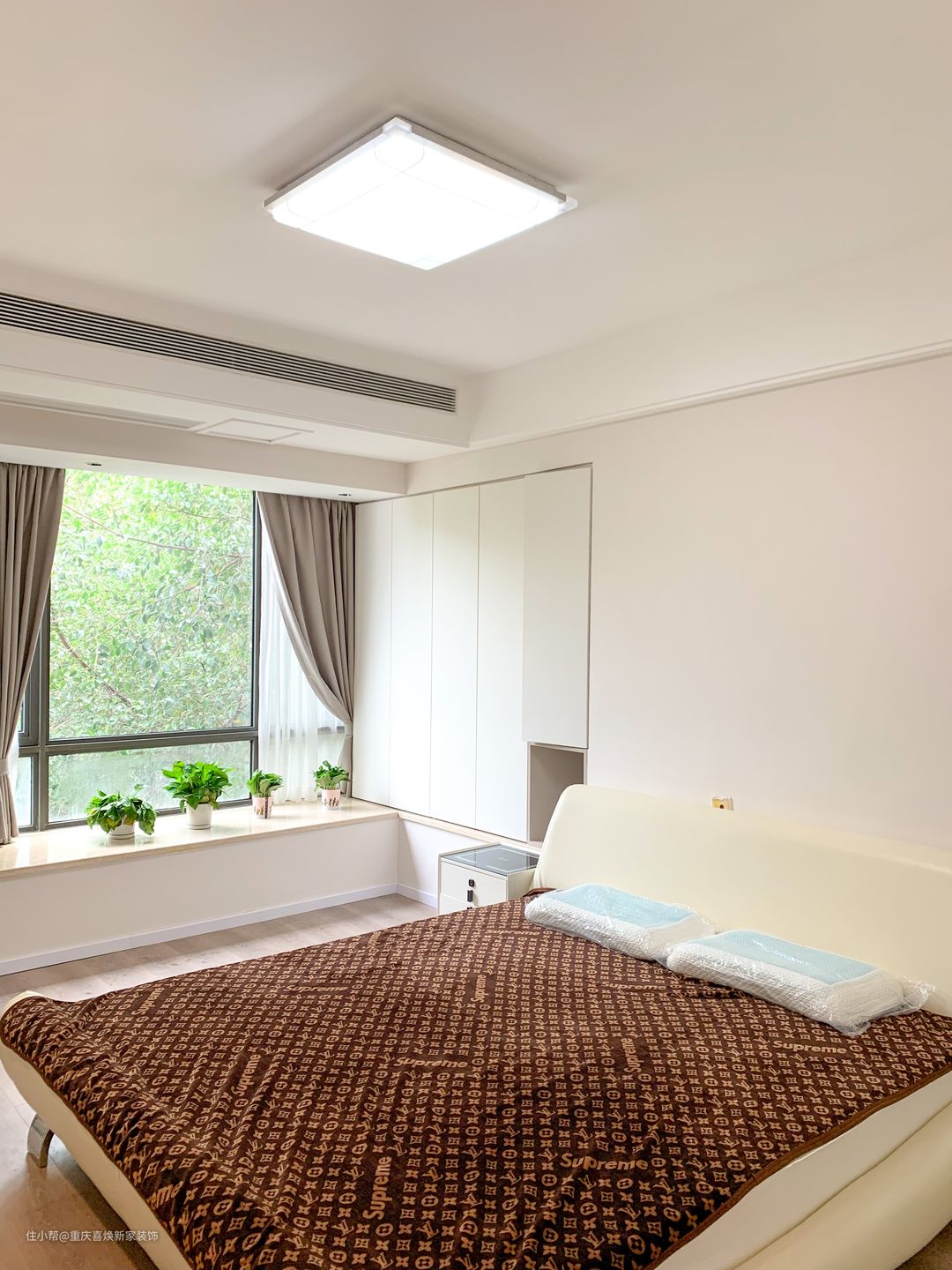 主卧走的是简约路线,整个空间都做减法设计,没有在上面添加多余的设计,墙面全部粉刷成白色乳胶漆,让空间更显精致。飘窗位置旁的墙体也是做了储物设计,增强空间的储物功能。