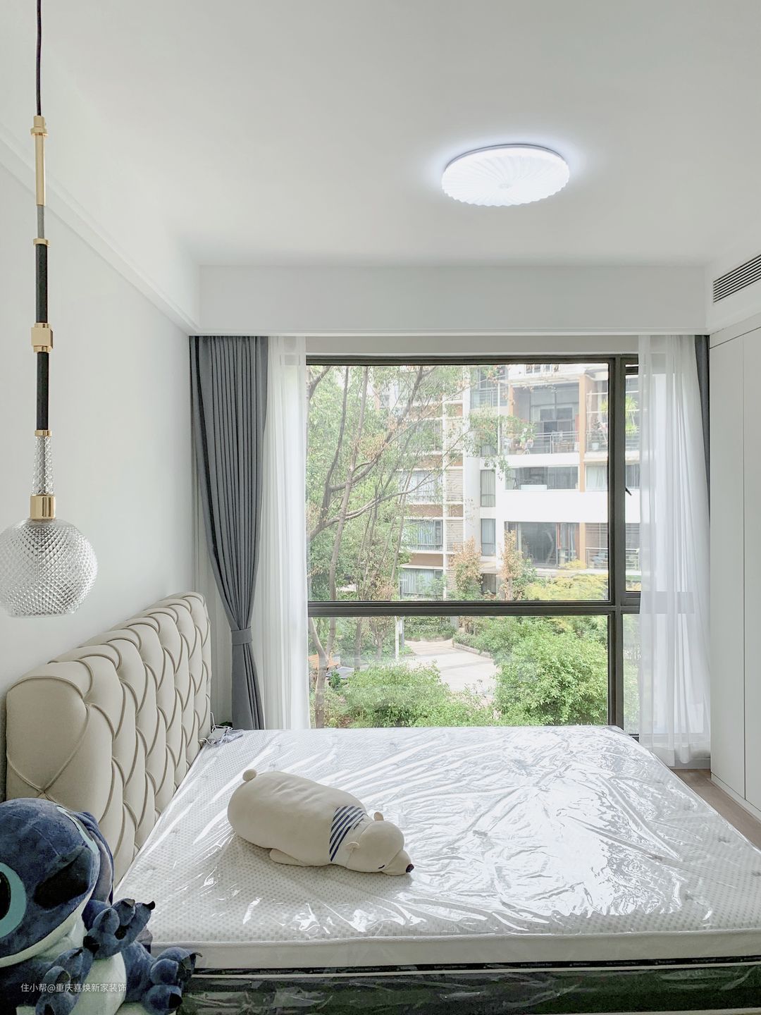 次卧同样没有做色彩干预,墙面粉刷灰色乳胶漆,高级又清爽,还耐磨耐脏。整面落地窗设计,让光线能更好的进入房间。