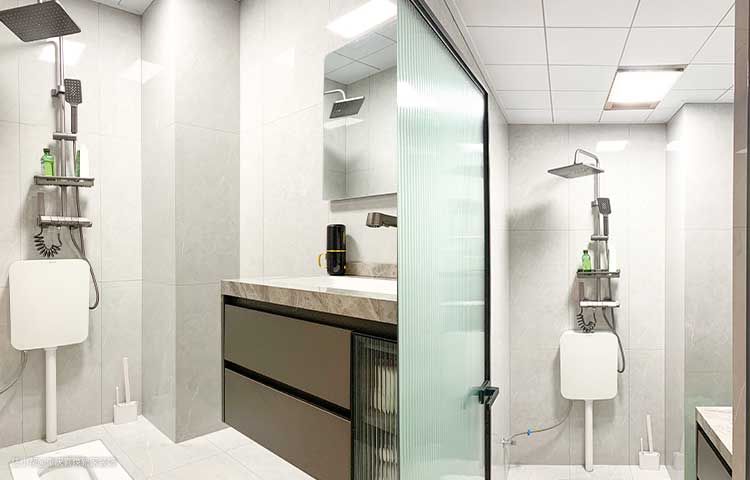 卫生间因为比较小,就没有做干湿分离,墙砖、地砖也都选择铺贴灰色瓷砖,耐脏耐磨。 悬挂式洗漱台,方便地面的清理打扫,防止墙面角落污垢滋生。