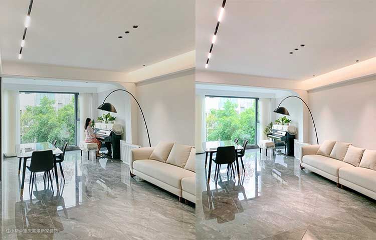 阳台跟客厅的分界处,做了当今较流行的弧形门洞设计,功能分区一目了然。最绝的是,这样拉通的扩充空间,让阳台足以放下一台钢琴的位置。