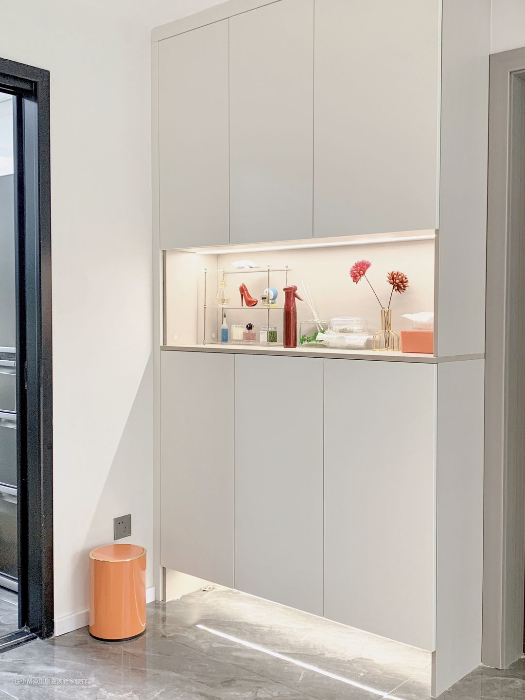入户门定制整面鞋柜。并在中间做中空设计,方便日常生活用品的摆放(钥匙、口罩等),还能摆放一些自己喜欢的装饰品,给空间注入活力。下面也留出一定位置,这样日常穿的鞋子就不会被闷住,变臭啦!