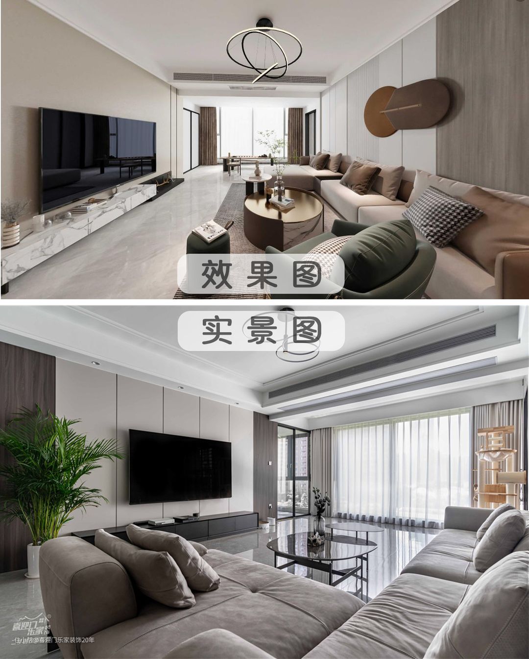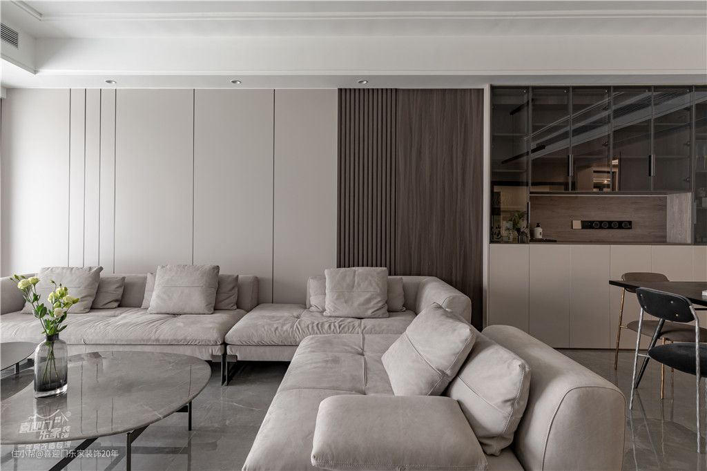 沙发背景墙采用檀香榆木搭配珍珠白,中间用烤漆木饰格栅做点缀,搭配上L型磨砂皮沙发,提升空间质感。