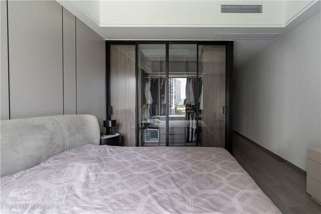 利用节省出来的空间做一个独立的2.65m*1.4m步入式U型衣帽间,搭配房间背景墙选用了米灰色的床,与背景墙同色系的梳妆台让整个空间看起来都十分的搭,毫无违和感。