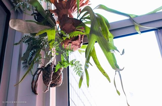 绿 仙 姑 的 居 家 养 植 经 验 分 享: 1、要根据植物本身对光照的需求,结合自家的光照条件来养。比如Roxanne家大体朝北,没有南向,光照条件不好,所以多选择喜阴的蕨类植物。较大的植物一般会固定摆放位置,很少挪动。较小的植物只有勤快搬运换位置,才能保证它们充足的光照。 2、植物多,相对应的蚊虫肯定会比一般的家庭多一些。所以土壤要时时打理,保证绝对干净健康,可以少招一些虫。在表土上方覆盖一些介质,如松树皮,陶土球等,也是有些帮助的。针对小虫子,还可以勤喷辣椒水。在酒精中加迷迭香、香茅、尤加利的精油(再加点水),喷洒也有用。 3、适合室内培养的悬挂植物制作和养护方法:保留植盆根系边的土壤,覆以水苔,外面用粗麻布和细线缠绕,定期喷水和营养液,植物就会慢慢长起来。除了悬空吊挂,还可以“上板”挂在墙上,就是把植物扎在蛇木(死掉的树蕨茎干)板上,让植物的根性长进去。蛇木疏松透气,很适合一些本来在森林中长在树枝上的兰花类及蕨类。(敲黑板,这条是重点) 4、最后一点,其实养植物的诀窍就是你多花心思。植物有生命,你常常去看它,它会感受到。