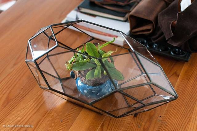 这个多面体原本是个玻璃灯罩,把它横着放过来,也成了植物的老巢。一些需要很潮湿环境的植物,如食虫植物(猪笼草、瓶子草等),可以种在可以相对保湿的玻璃瓶中。