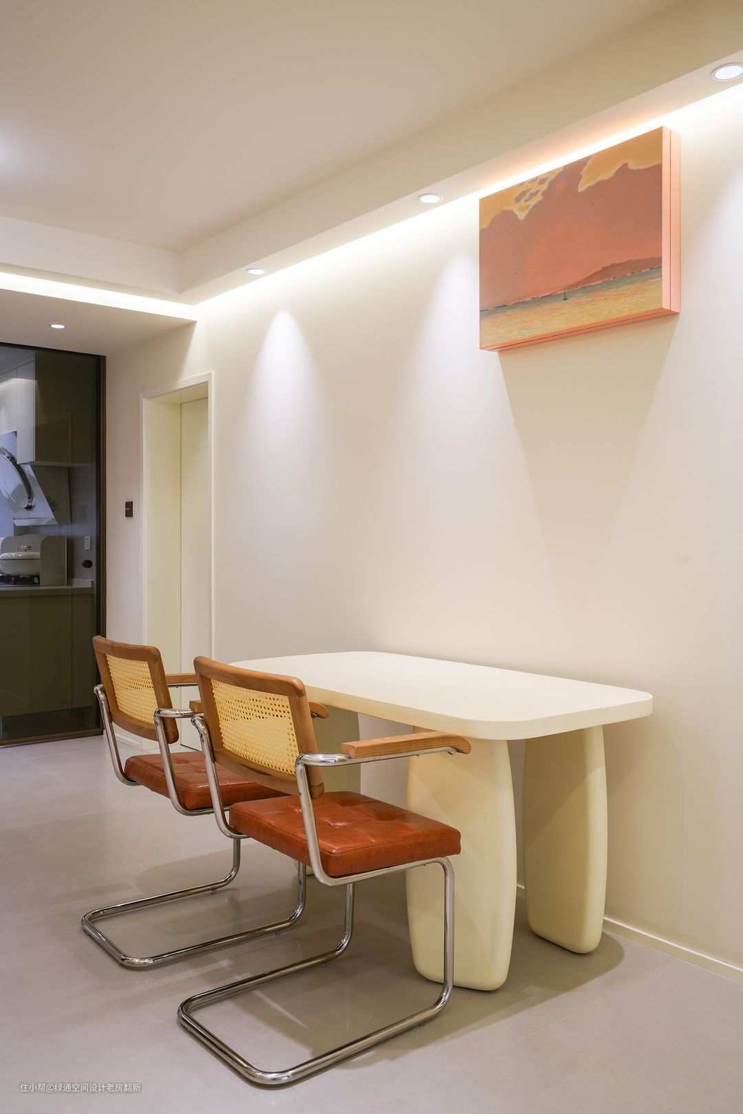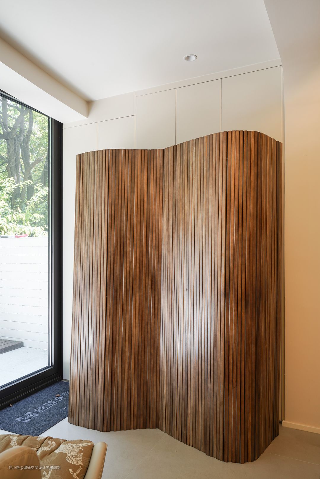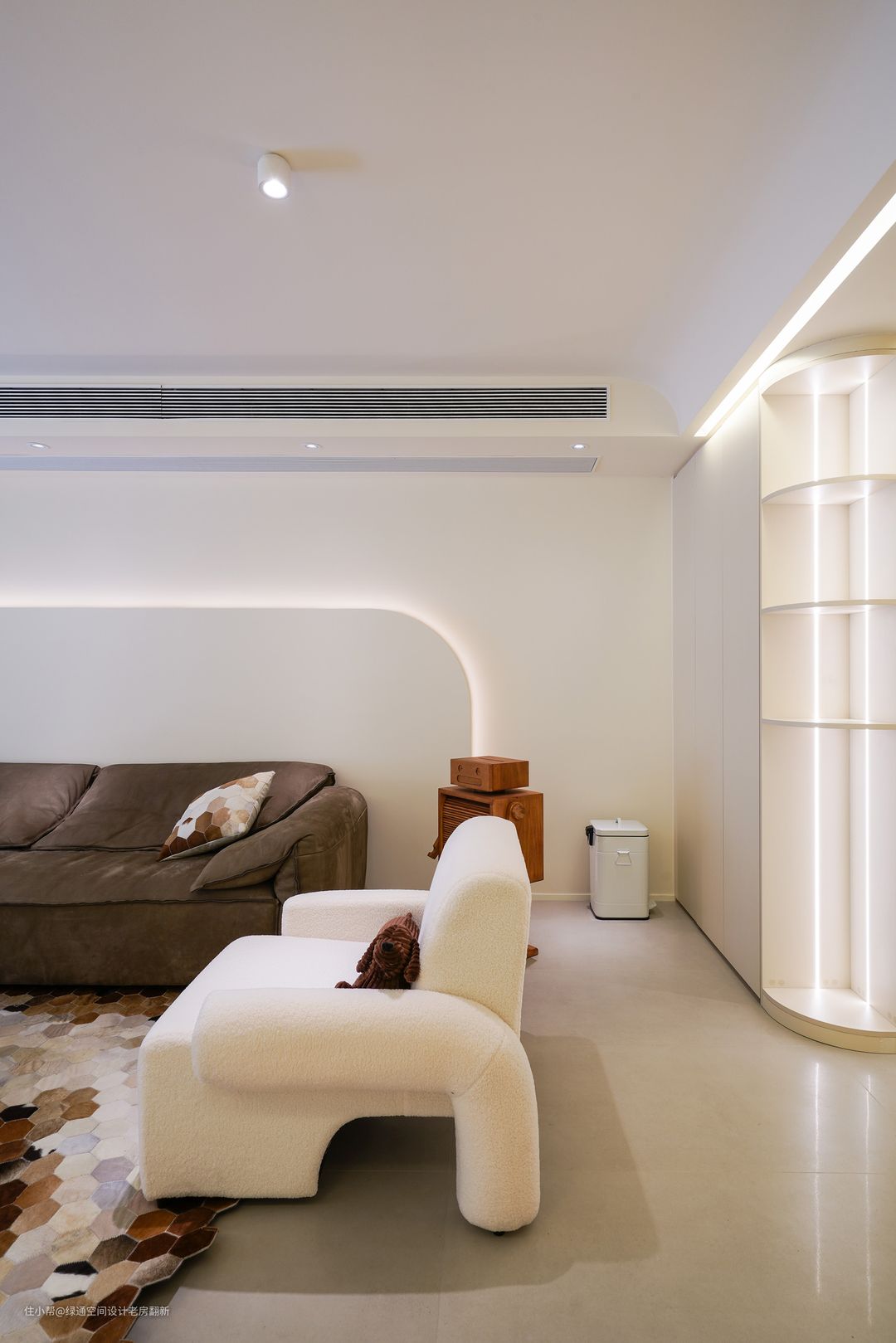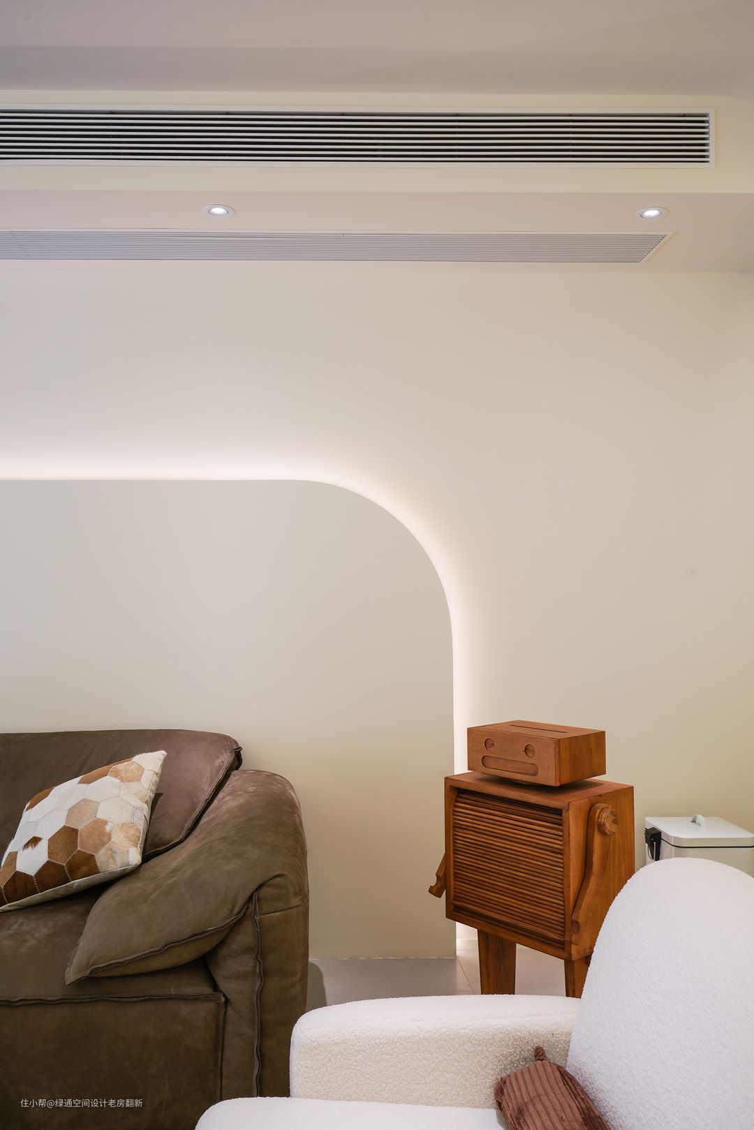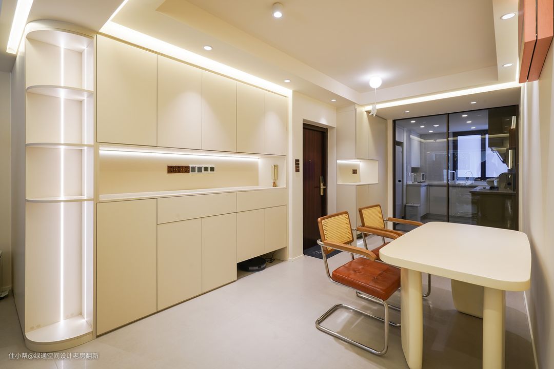 餐厅和客厅墙面有一处直角墙面,感觉和整体风格氛围不搭, 利用餐边柜和客厅装饰柜组合直角部分用弧形隔断柜既可以规避直角的弊端,又可增加装饰性。