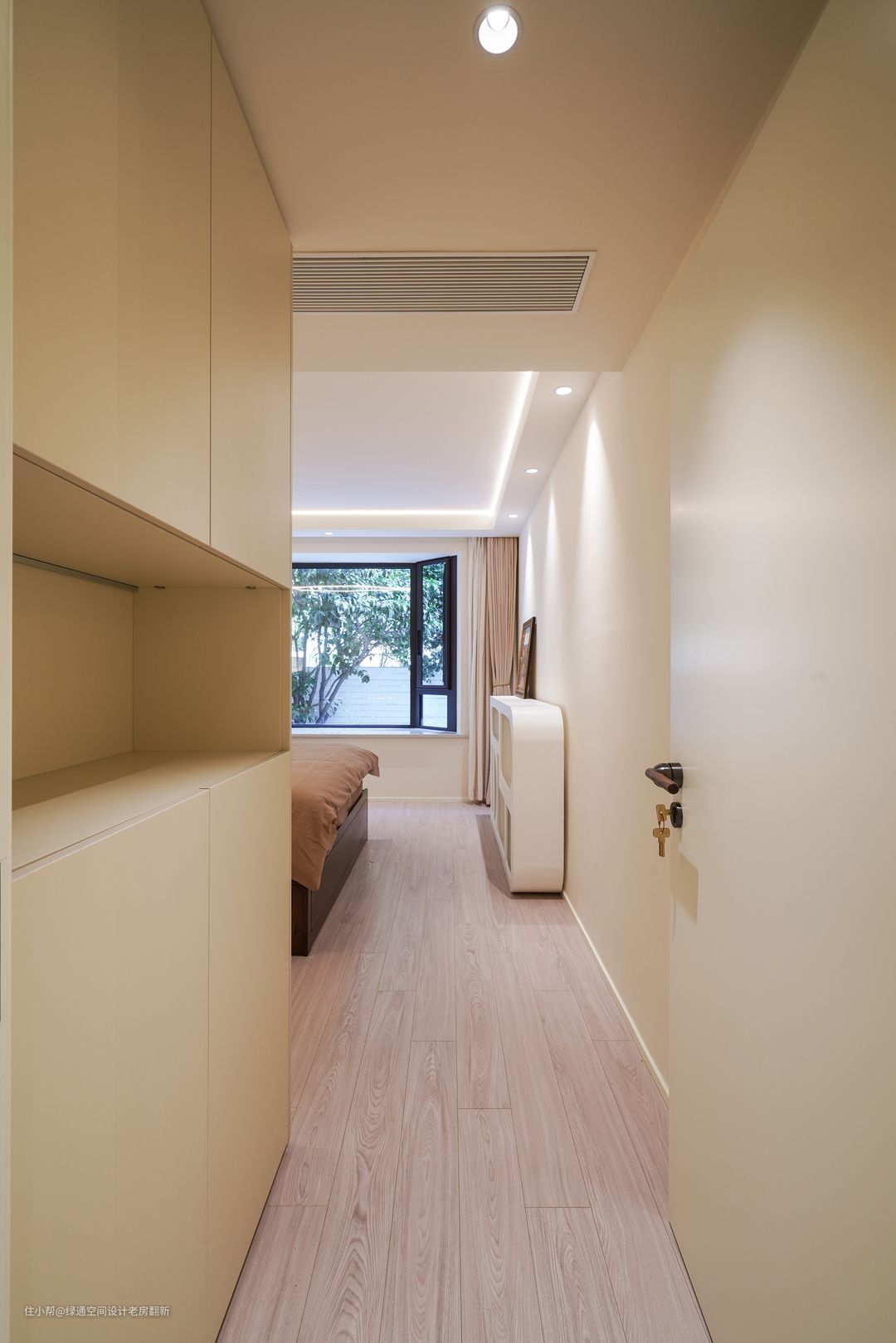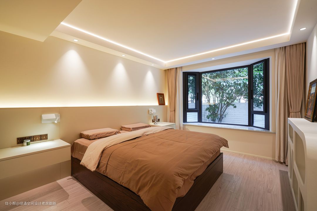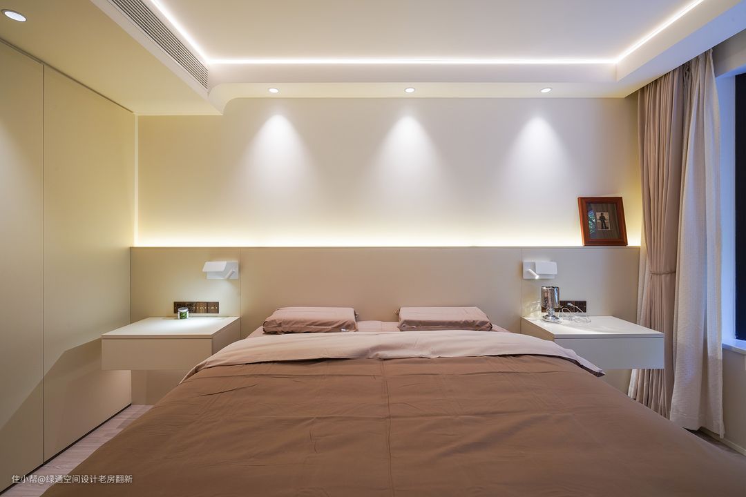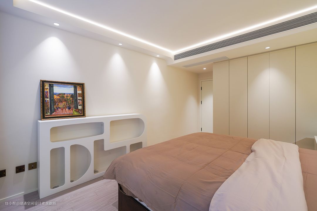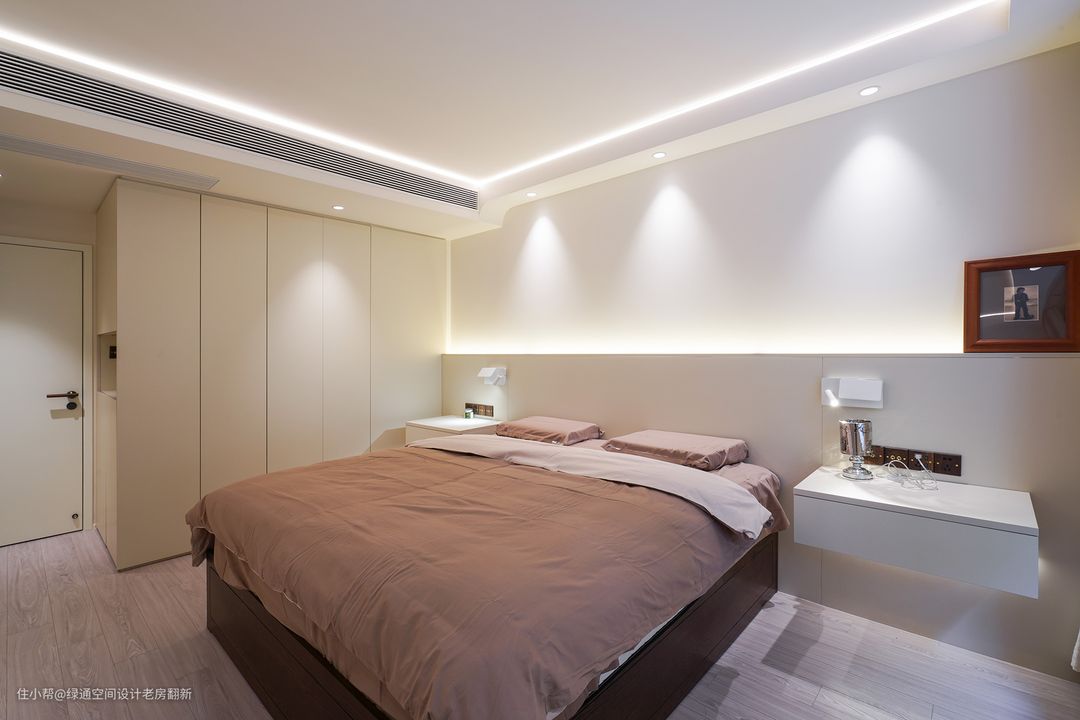 主卧设计浅咖色床靠背景代替传统床头,搭配灰粉色的床品,两侧床头柜采用悬浮式,简洁大气好打理,使用无主灯设计,利用顶面线条灯搭配射灯和床头背景灯,增加整体的氛围感,中央空调风口加长,从视觉上延伸空间。