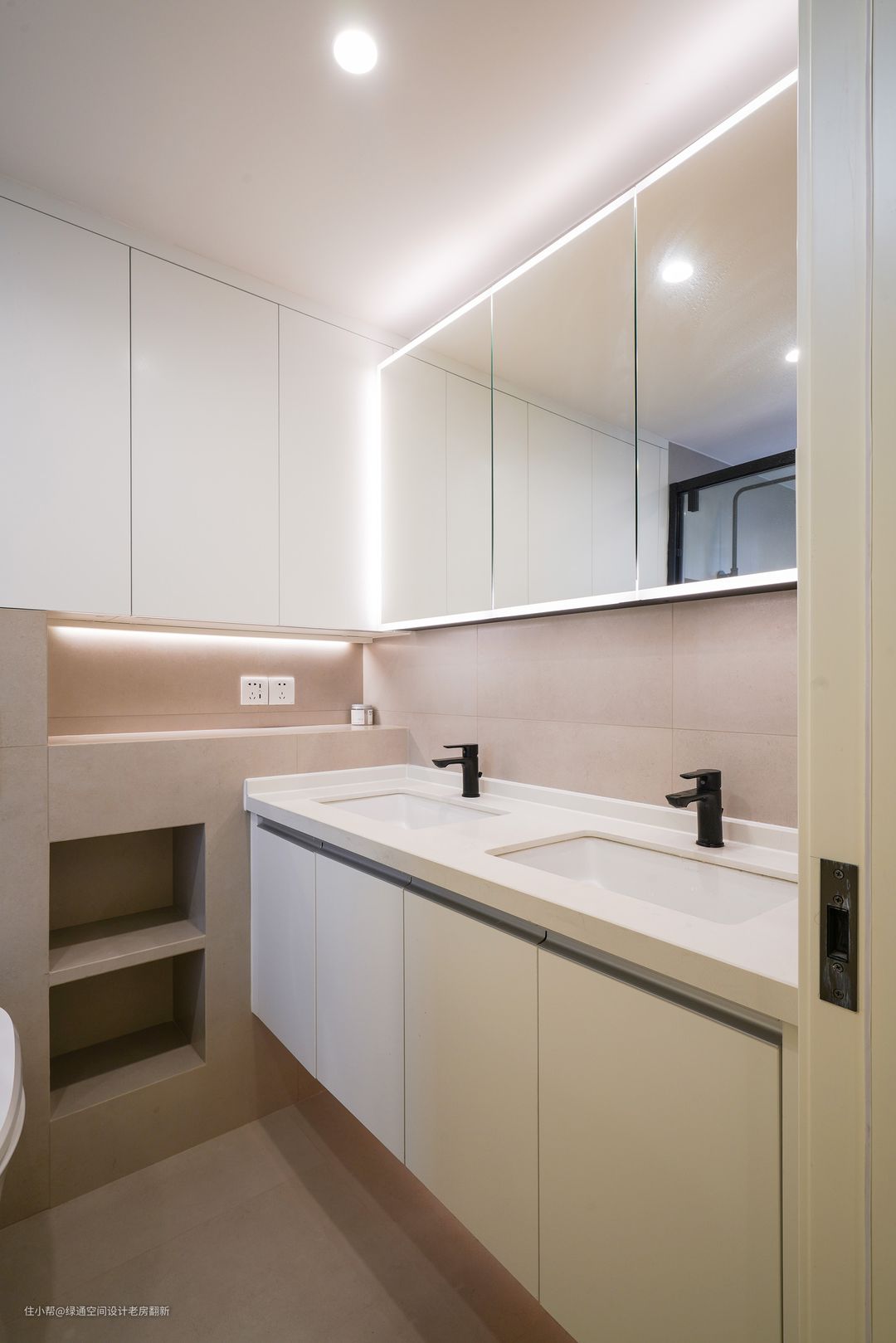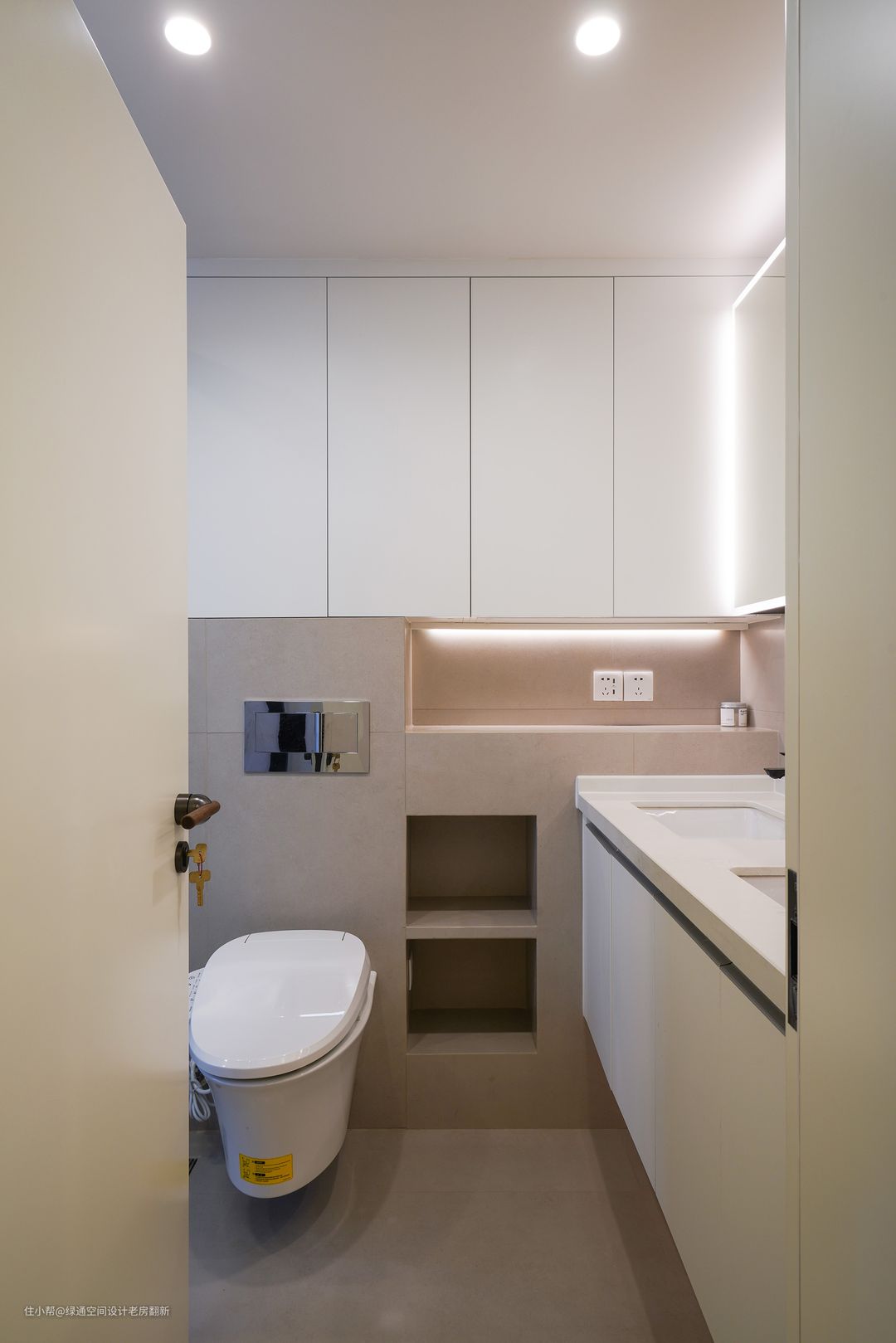 利用卫生间包管的厚度制作壁龛和放置壁挂马桶的水箱,充分利用空间。