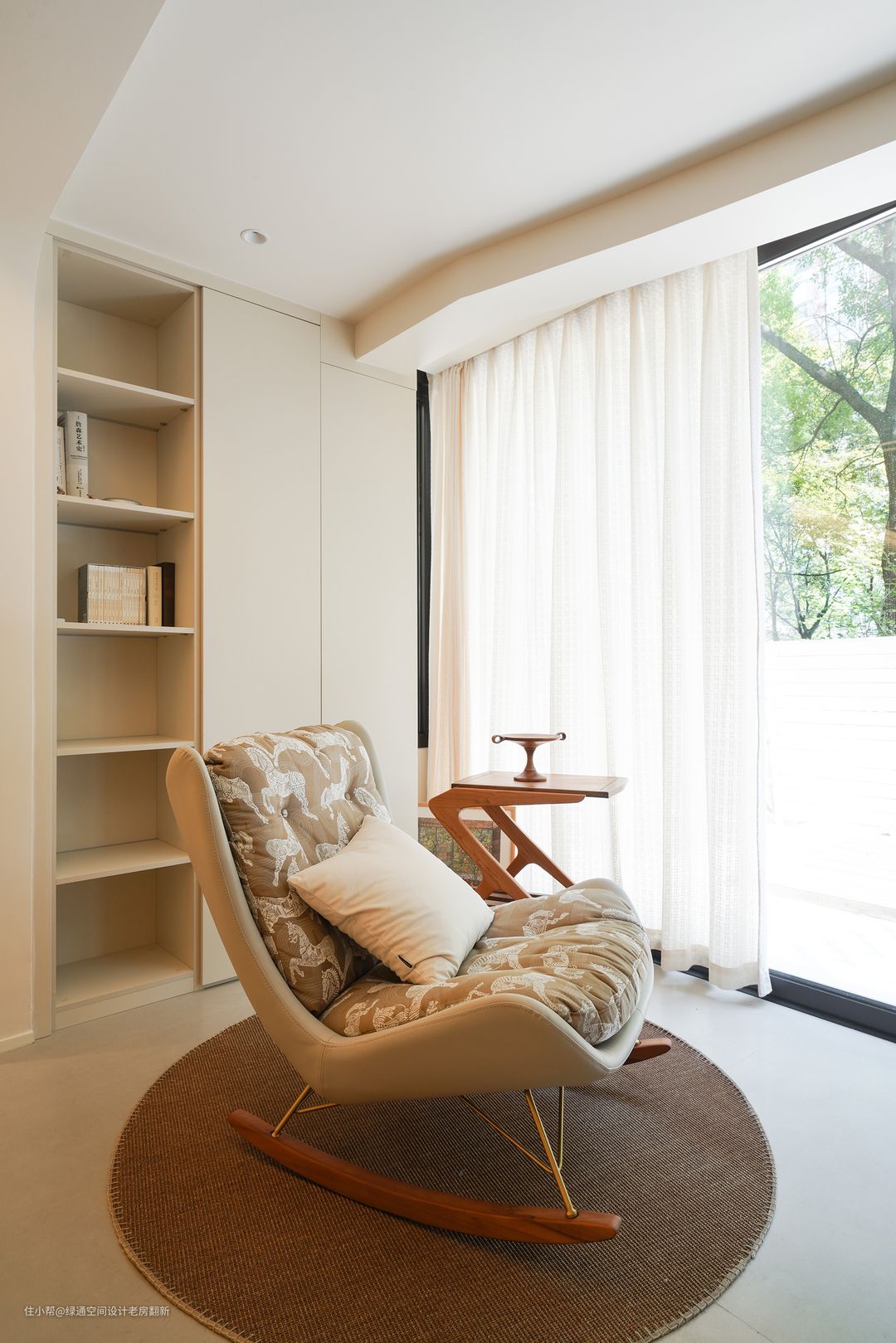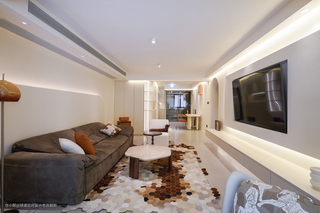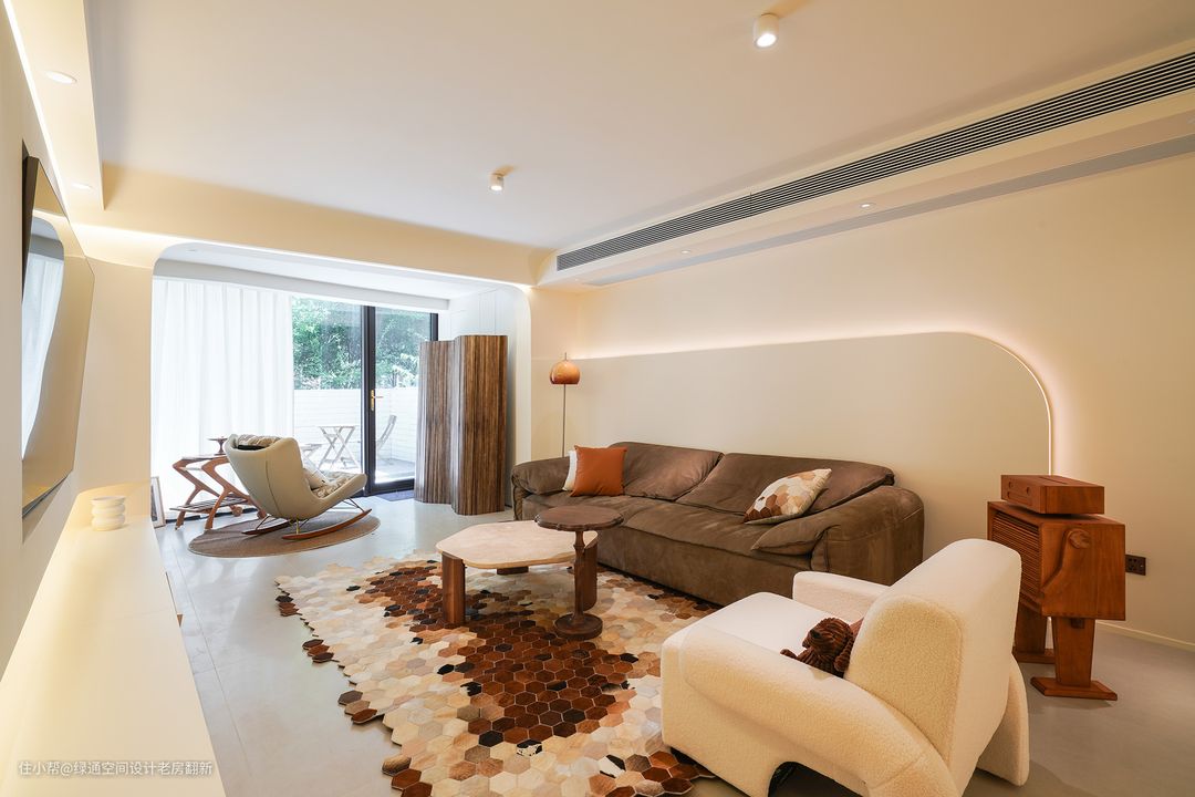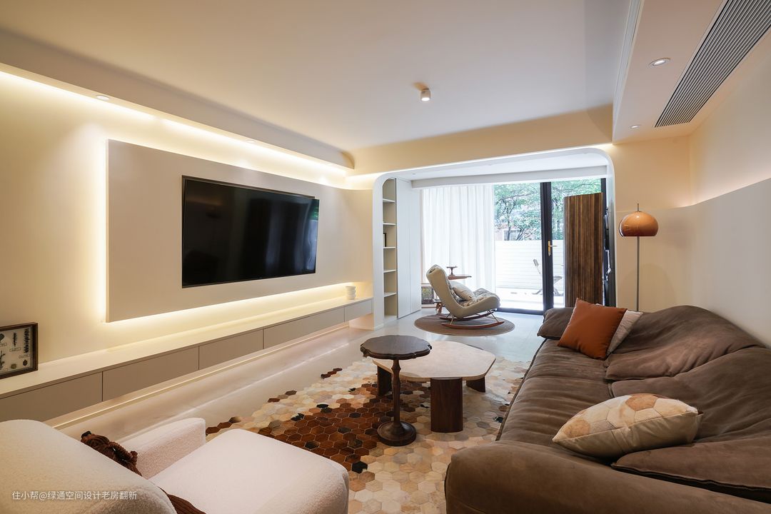 客厅电视背景和沙发背景造型采用弧形设计过度到阳台,搭配墙面颜色整体感觉柔和放松。