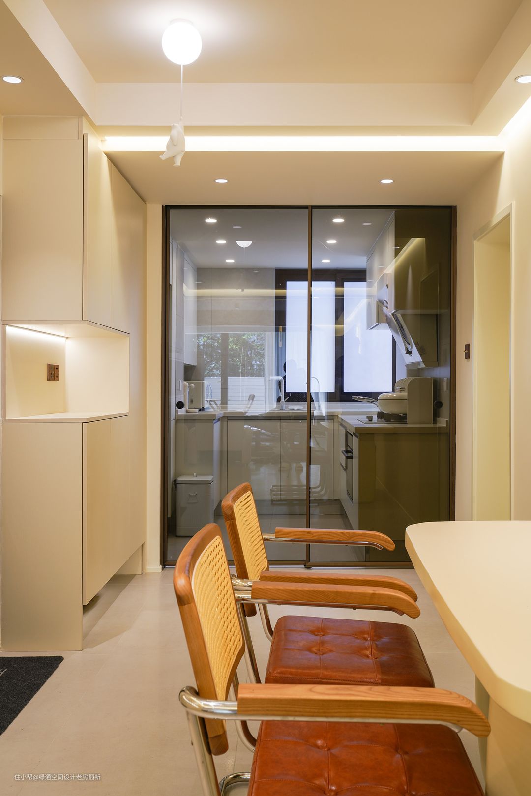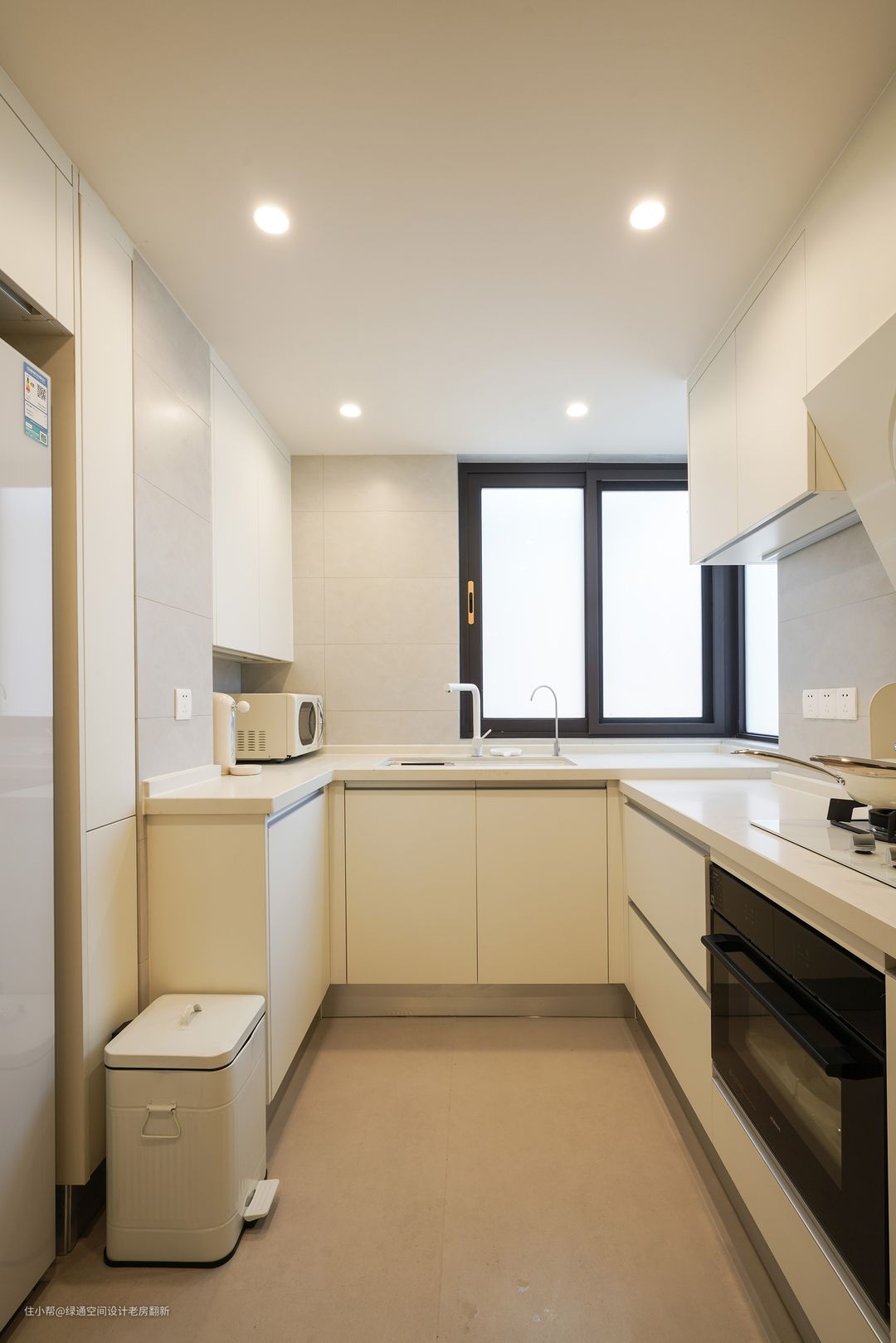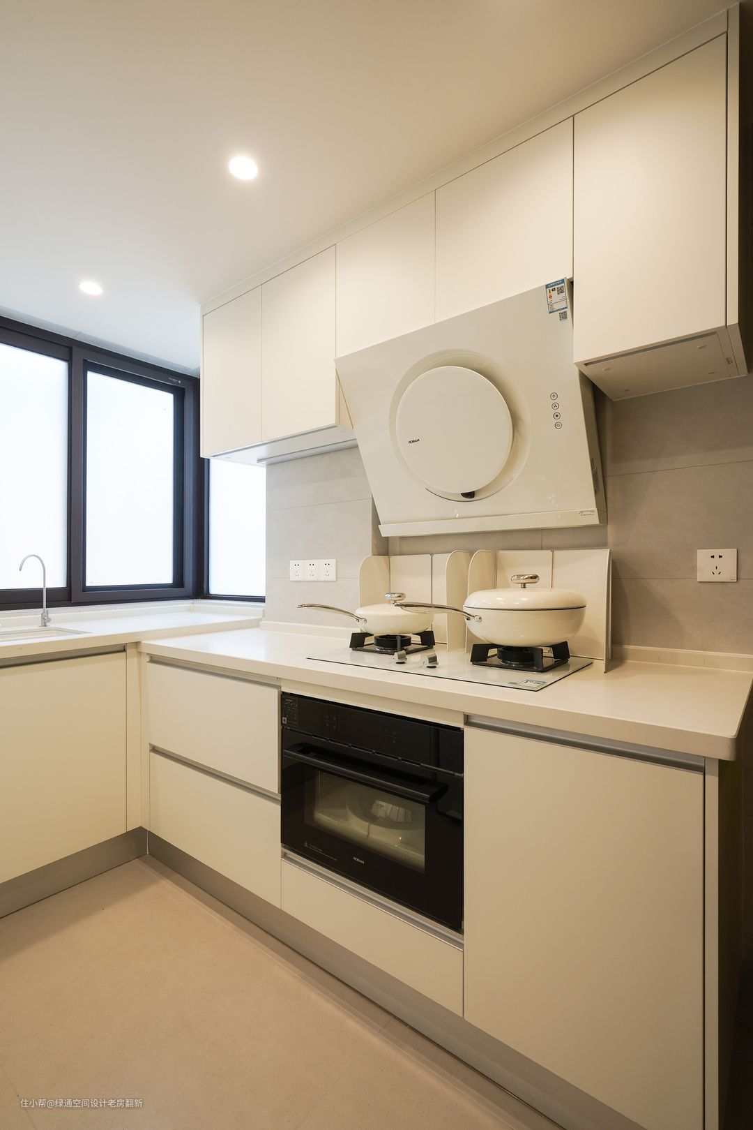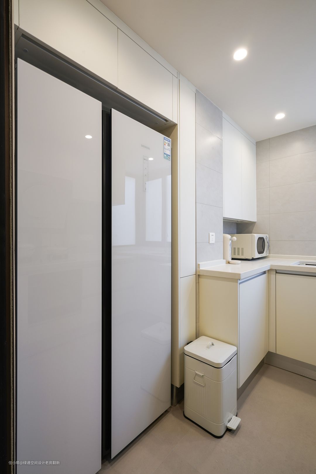 原有厨房扩大一些,里面可以放对开门冰箱,橱柜做高低台面,水槽部分台面抬高,使用起来更加方便。柜门颜色采用肤感白色,搭配灰色墙砖,干净整洁。