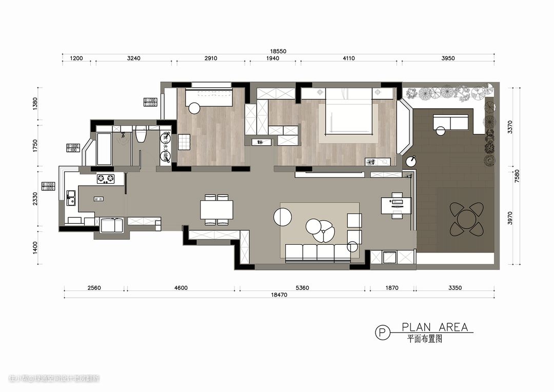 业主需求: 业主保留一个公共卫生间,主卧需要衣帽间。露台希望作为洗衣晾晒+休闲娱乐功能。整体色调奶油色。