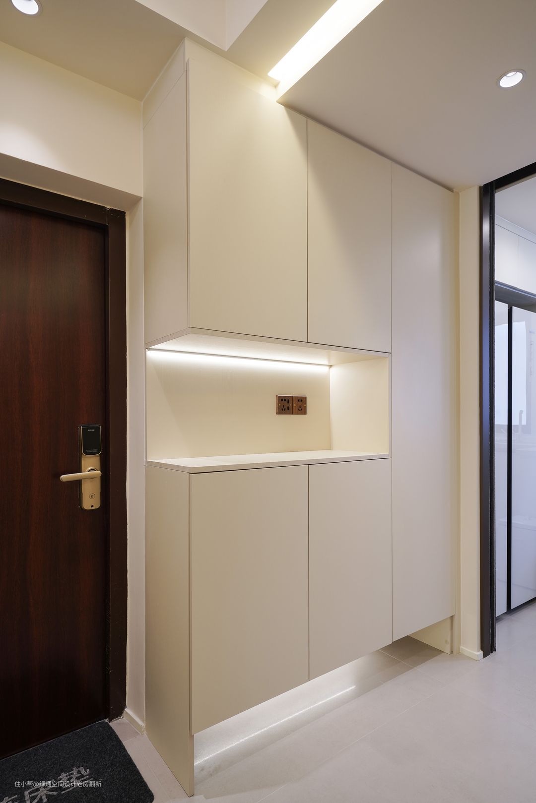 入户左侧安装鞋柜及储物柜设计。