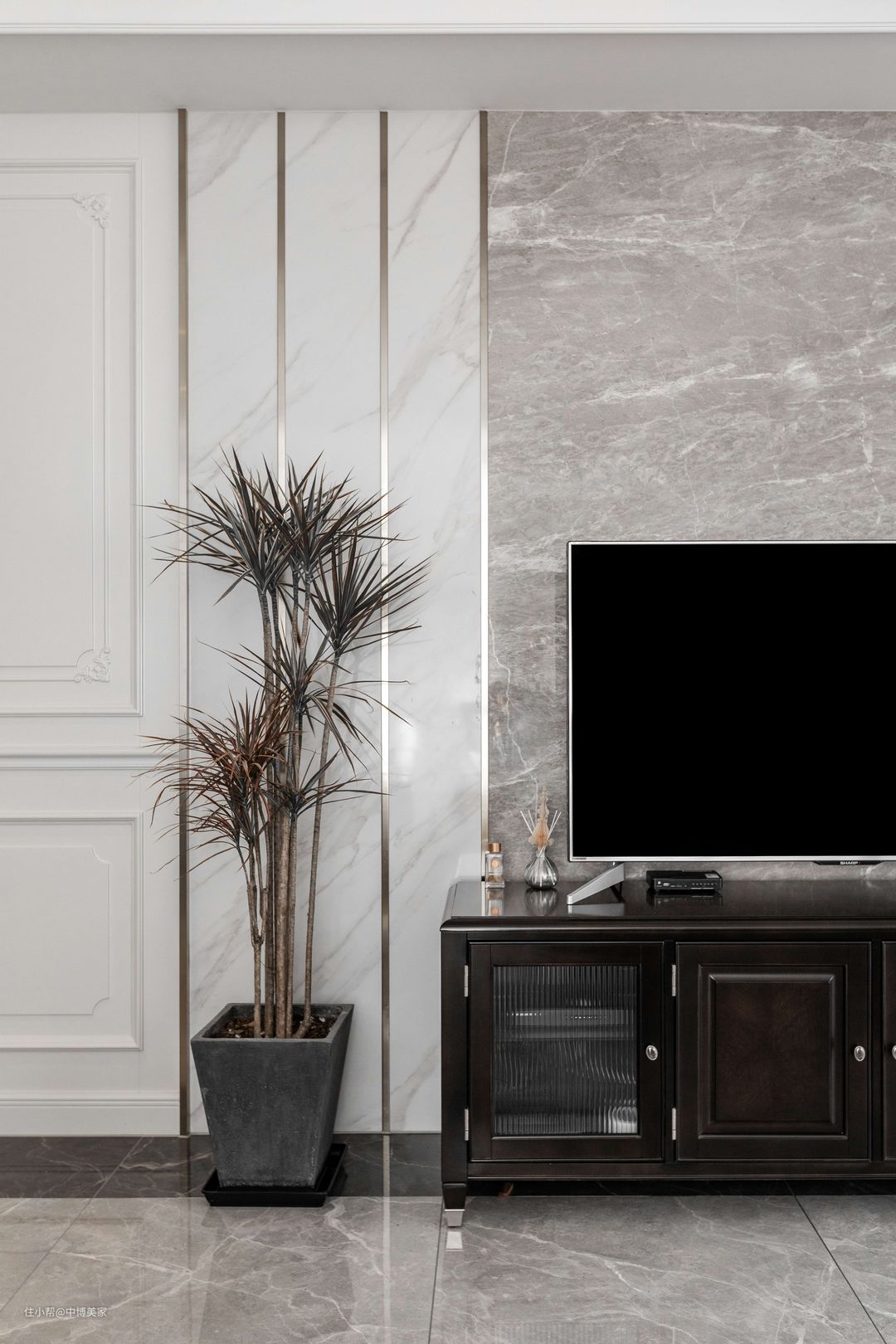 灰色大理石的电视墙与黑色系的实木电视柜相结合,让灰白色调的客厅在沉静、冷艳中多了一丝的轻快与灵动。