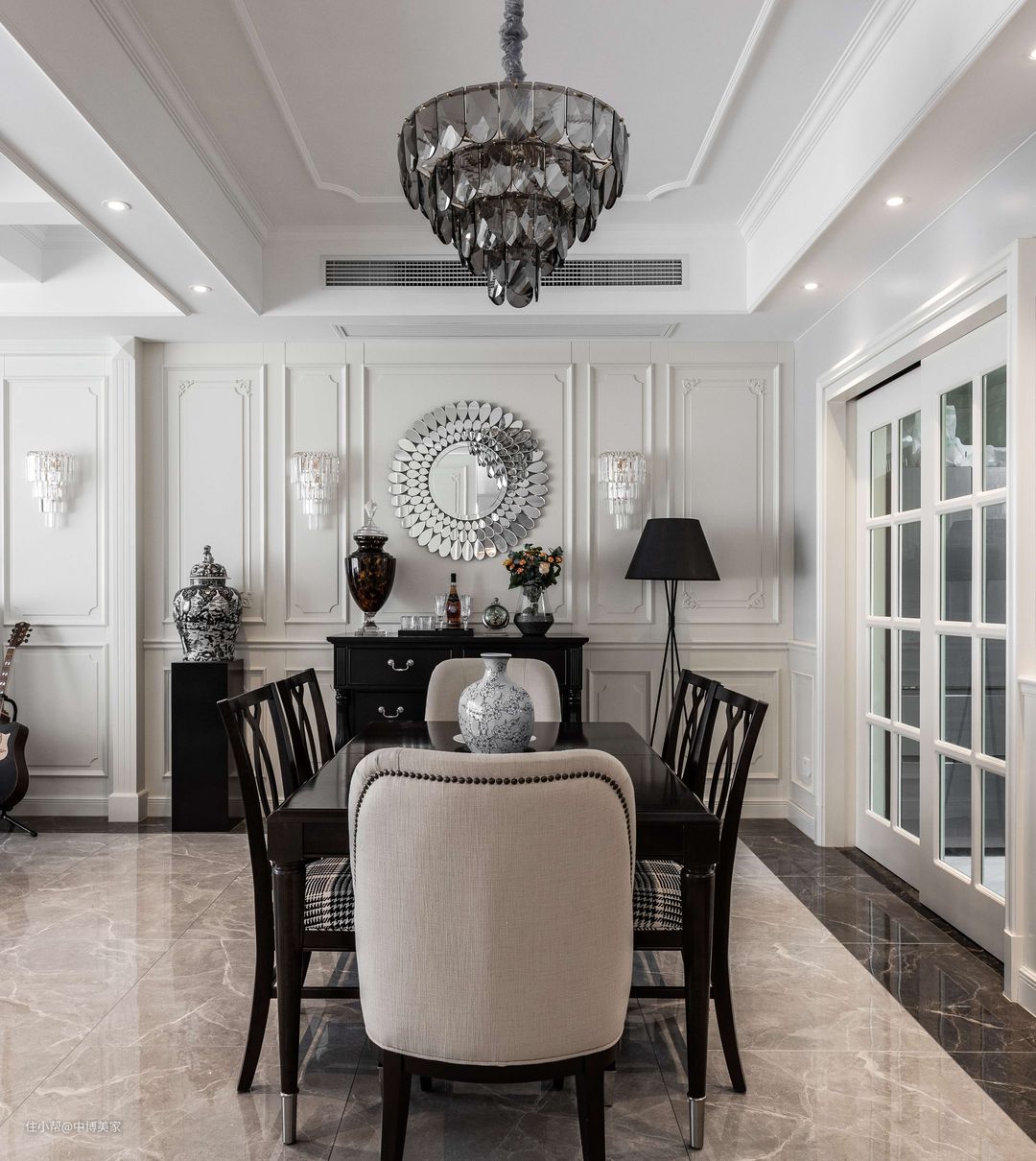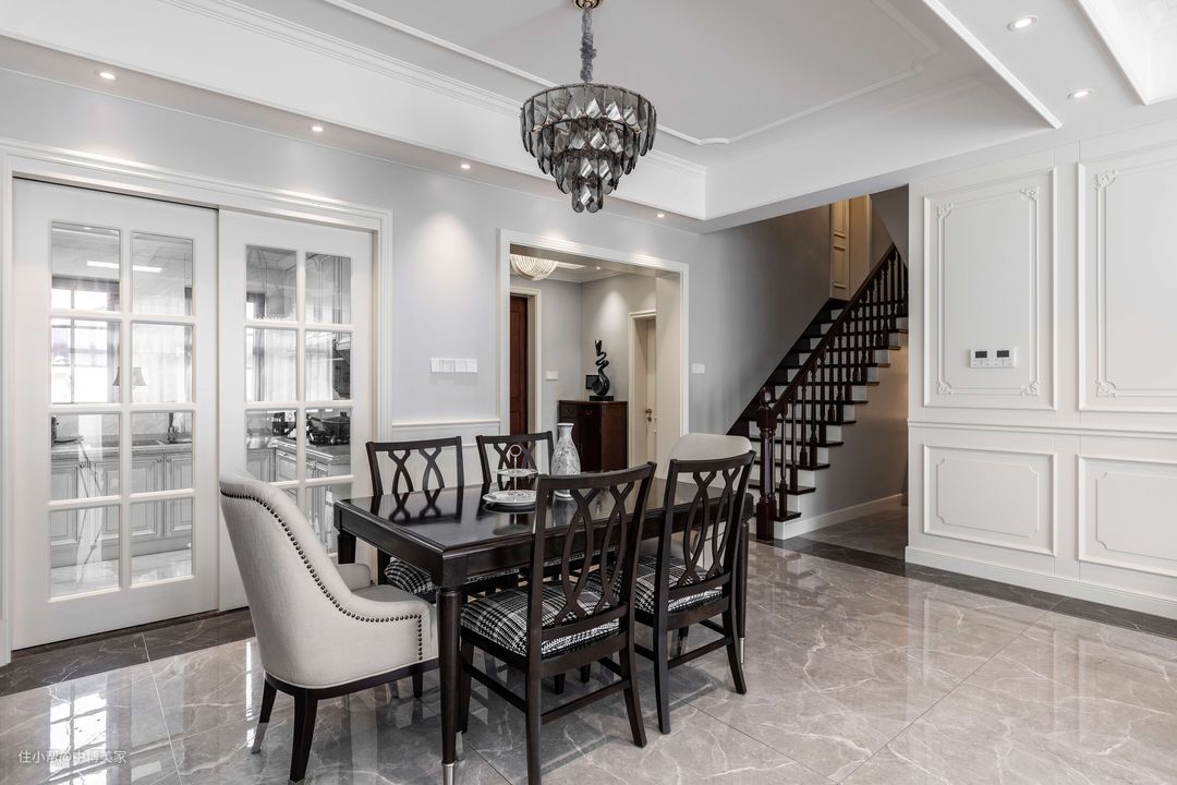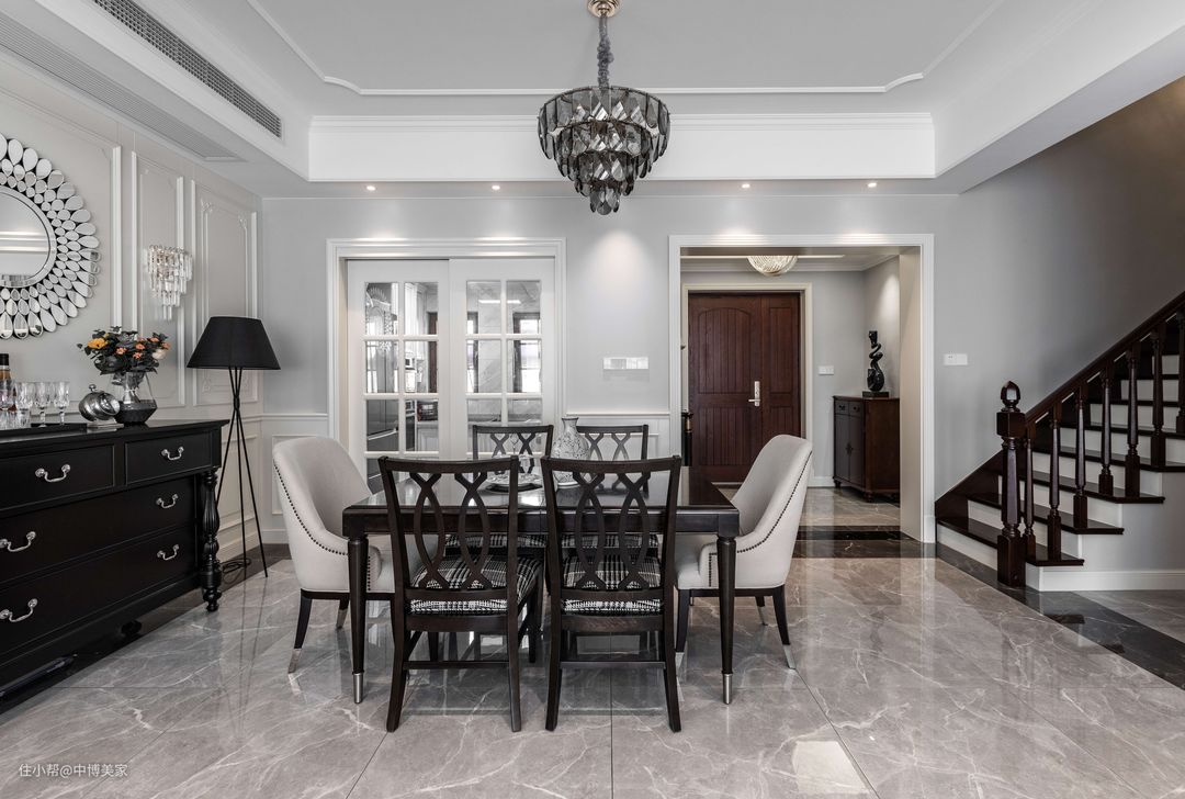 餐厅与客厅呈开放式,黑色的餐桌搭配黑色实木和米色皮质餐椅,尽显贵族气息。