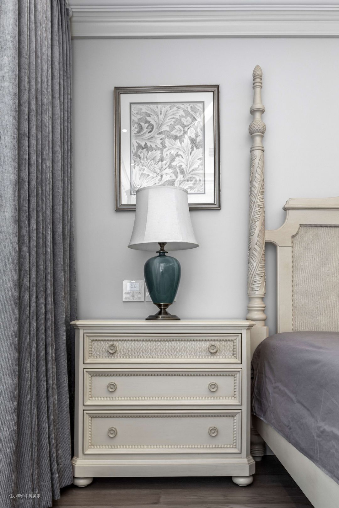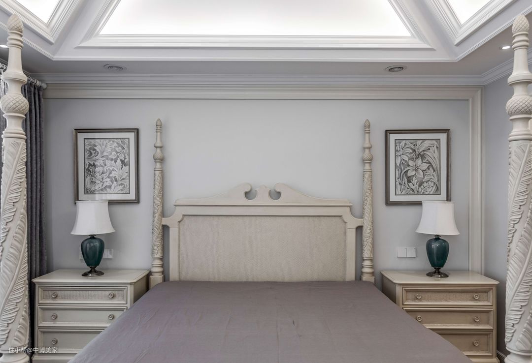 欧式的白色大床,四周有实木雕花柱子加持,显得更加有艺术性。
