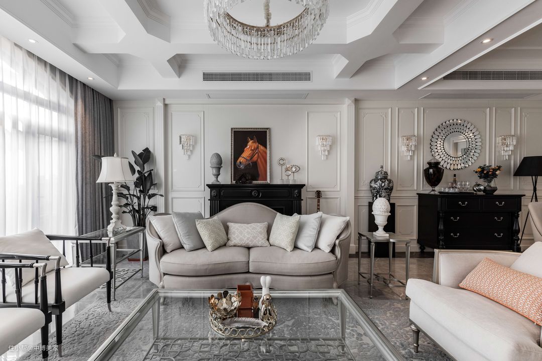 本案主色调以暖白色为主,加入黑色、金属色点缀,融入了时下流行的法式轻奢元素,主要凸显居室的舒适性和功能性,满足一家三代人住在一起的所有需求。