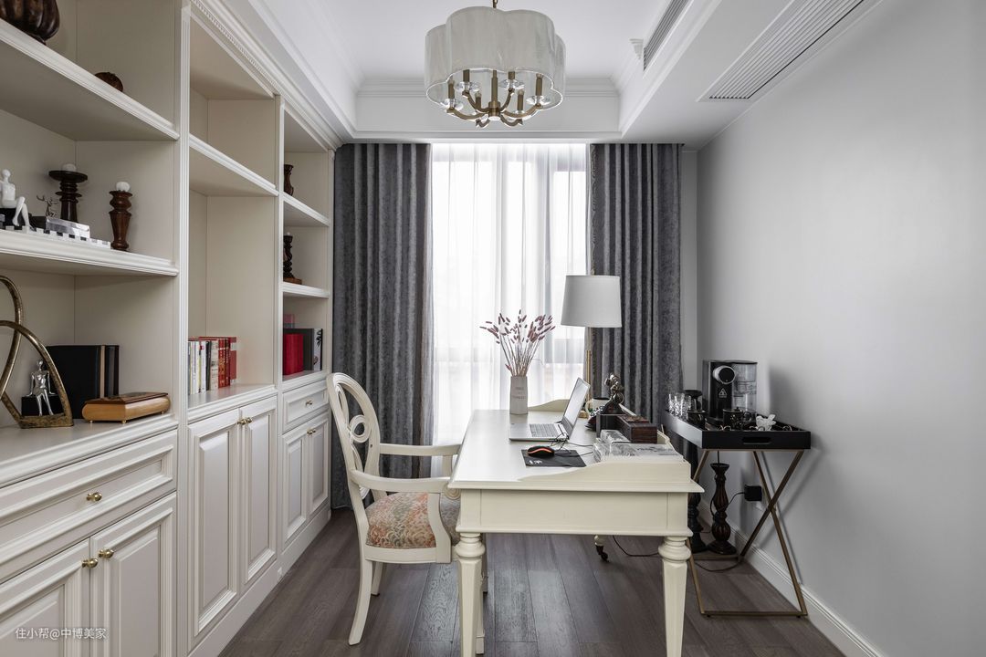 白色系的定制柜子不仅可以储存更多物品,上面开放式的格子可摆放主人喜爱的书籍和物件,欧式风格的书桌椅烘托出屋主的品味。
