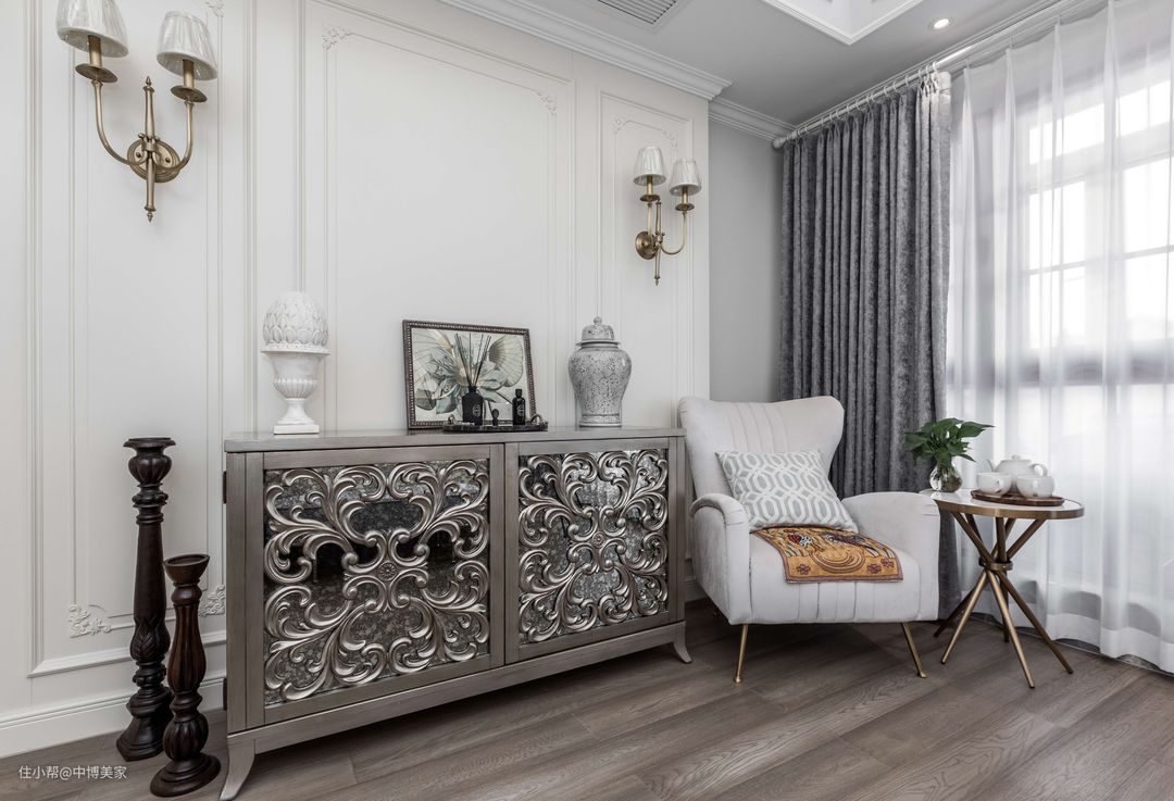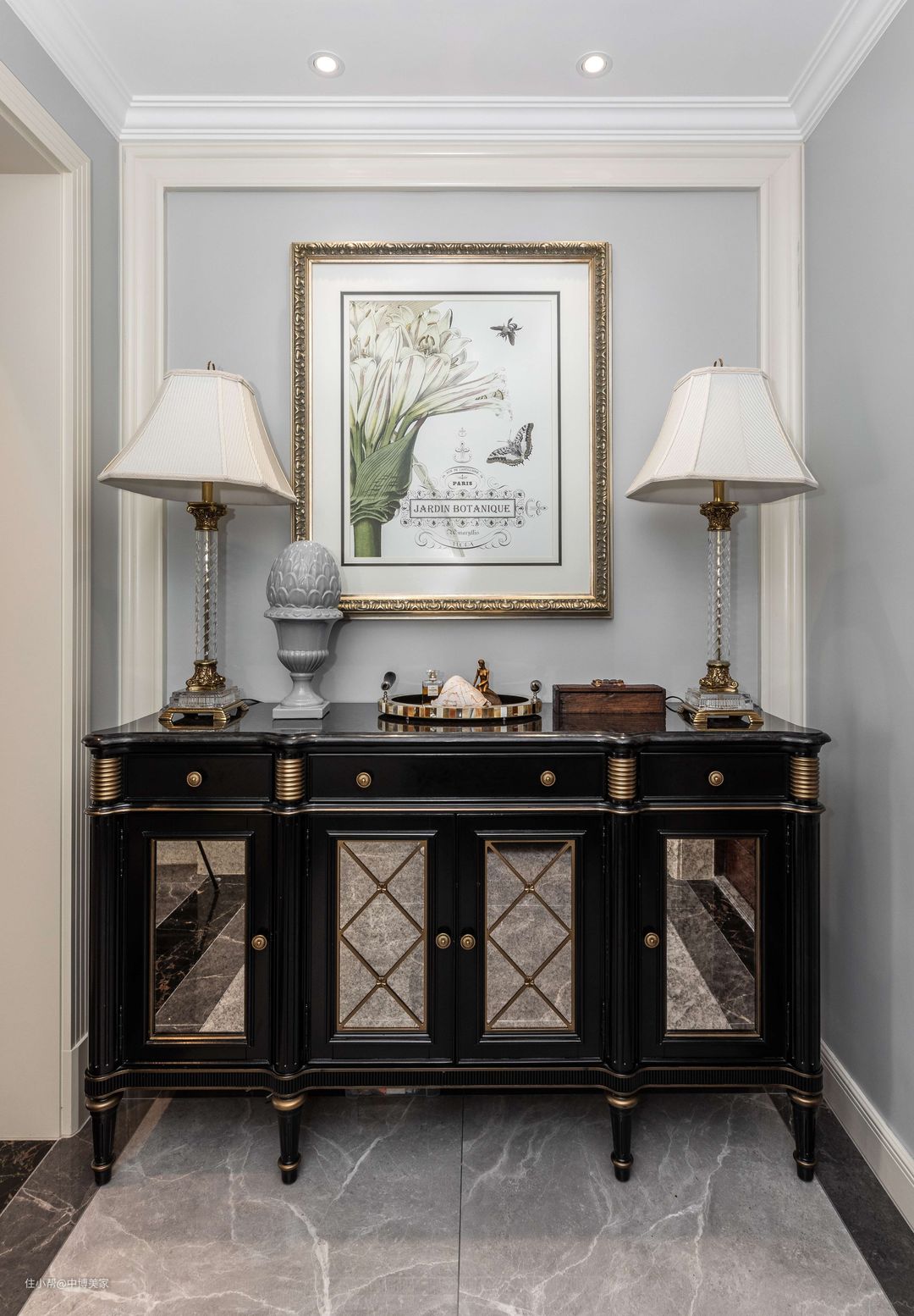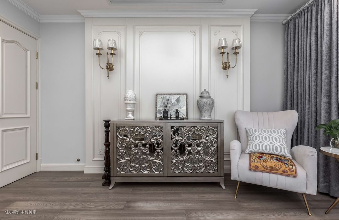 浅灰色的背景墙面,简约大气,挂着一幅清新的画作,浪漫之感扑面而来。灰色系的瓷砖和法式风格柜子搭配,展现高贵典雅的气质。