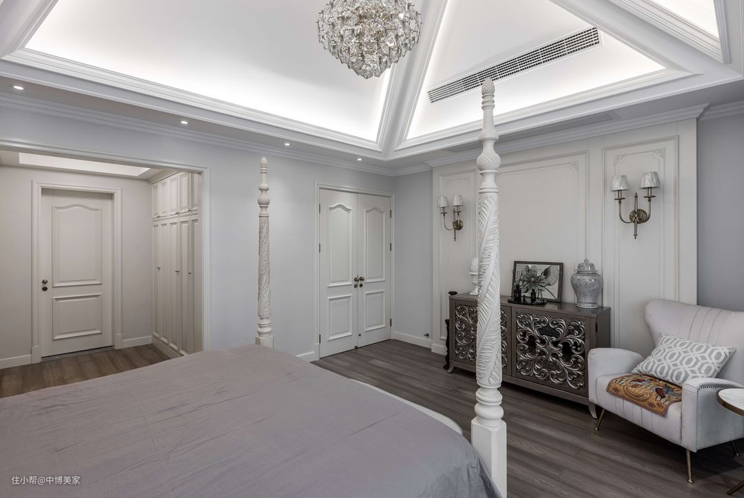 主卧同样以暖白色的墙面打造,配上木质的地板以及三角的吊灯,缔造了法式的温婉大气。