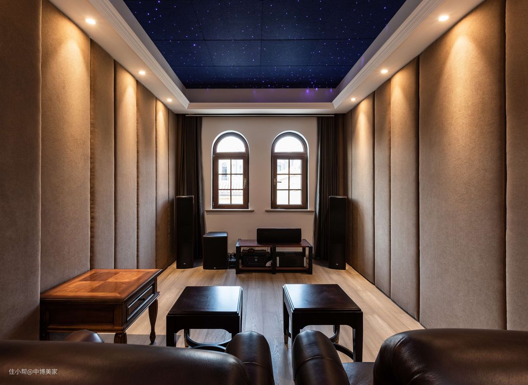 灰色系的墙壁软包与同色系皮质沙发很好地融合在一起,天花板则使用了星空的背景,显得格外与众不同。
