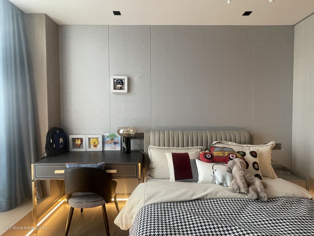床的左侧预留的空间也比较大,可以作为孩子休闲娱乐的小空间。通顶的衣橱也放在此处边上,配色上没有选用全灰去贴饰,避免了柜体的笨重感。