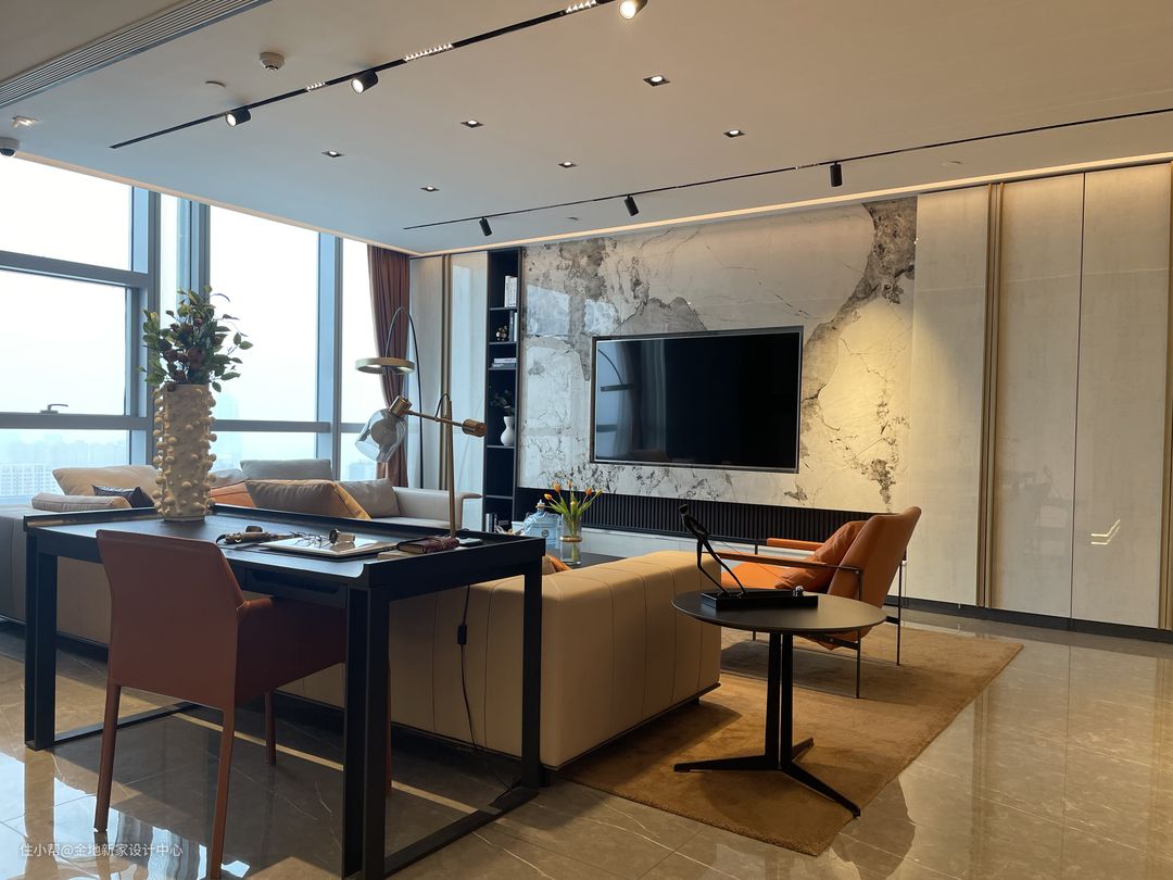 电视背景墙以大理石做内嵌电视+开放式收纳柜的设计,提高安全系数又增加了收纳的空间。令杨先生特别满意的是电视一旁的通顶柜门❤,隐形的亚克力柜门利用金属边做柜体把手,凸显高级质感又不显突兀,我们在柜门背面加了防变形的拉直器,门体不会因为过高长而易变形。