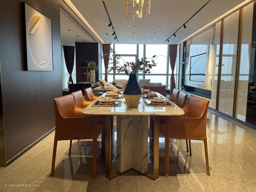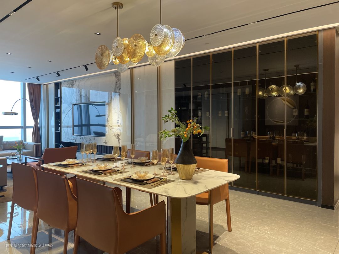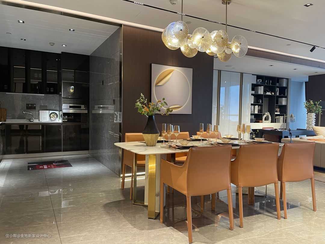 在软装上,我们选择亮面的大理石餐桌,带出高贵的轻奢感,再搭配皮质的座椅以及磨砂黑的餐厅背景墙去平衡高调的气场,低调透出高级。