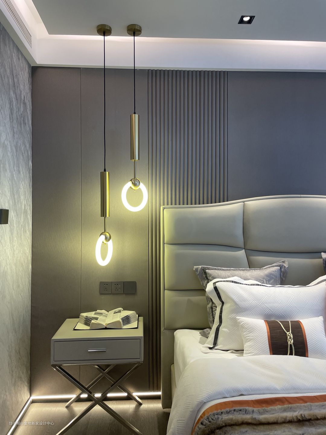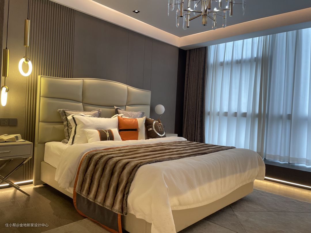 主卧以更为轻简的白色为主,舒适感更强,能更好地放松下来助眠。床头的木饰面板用了格栅线条的元素,利用细节打造出精致的层次感。
