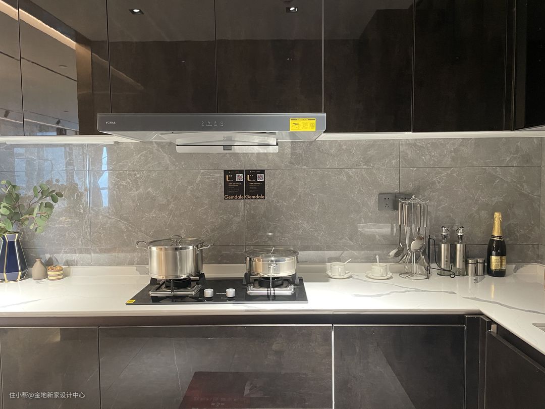 厨房和主空间通铺了地砖,墙面与之呼应选择了同色系的瓷砖,以黑白灰塑造出精简又具有高级轻奢感的开放式料理间。 台面用的是石英石材质,做了前挡水,不易刮花也易清洁。