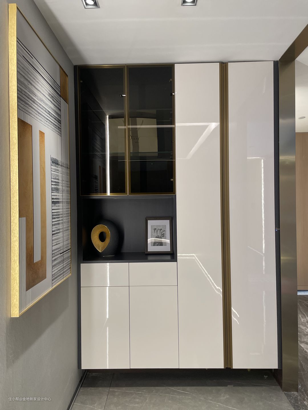 杨先生屋外的电梯间过道上已经设有了鞋柜,因此入户的玄关处定制了一面收纳柜,可供屋主们存放不常用的物品,例如非当季的鞋子、雨伞、纸巾等杂物。 亚克力面板的柜门在入户的时候就凸显出轻奢的韵味。黑色的镂空和玻璃吊柜避免了整面柜的带来的笨重压抑。
