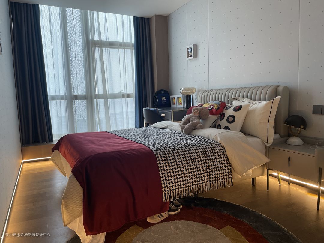 孩子的房间轻奢气息就没有设计得特别重,以舒适实用为主,同样再地台做了夜灯的细节设计,怕黑的小孩也有十足安全感😊 考虑到孩子的床和桌椅高度的设定,飘窗我们特意做了低高度的处理,让空间显得更轻快有层次一些,也能增强采光性。