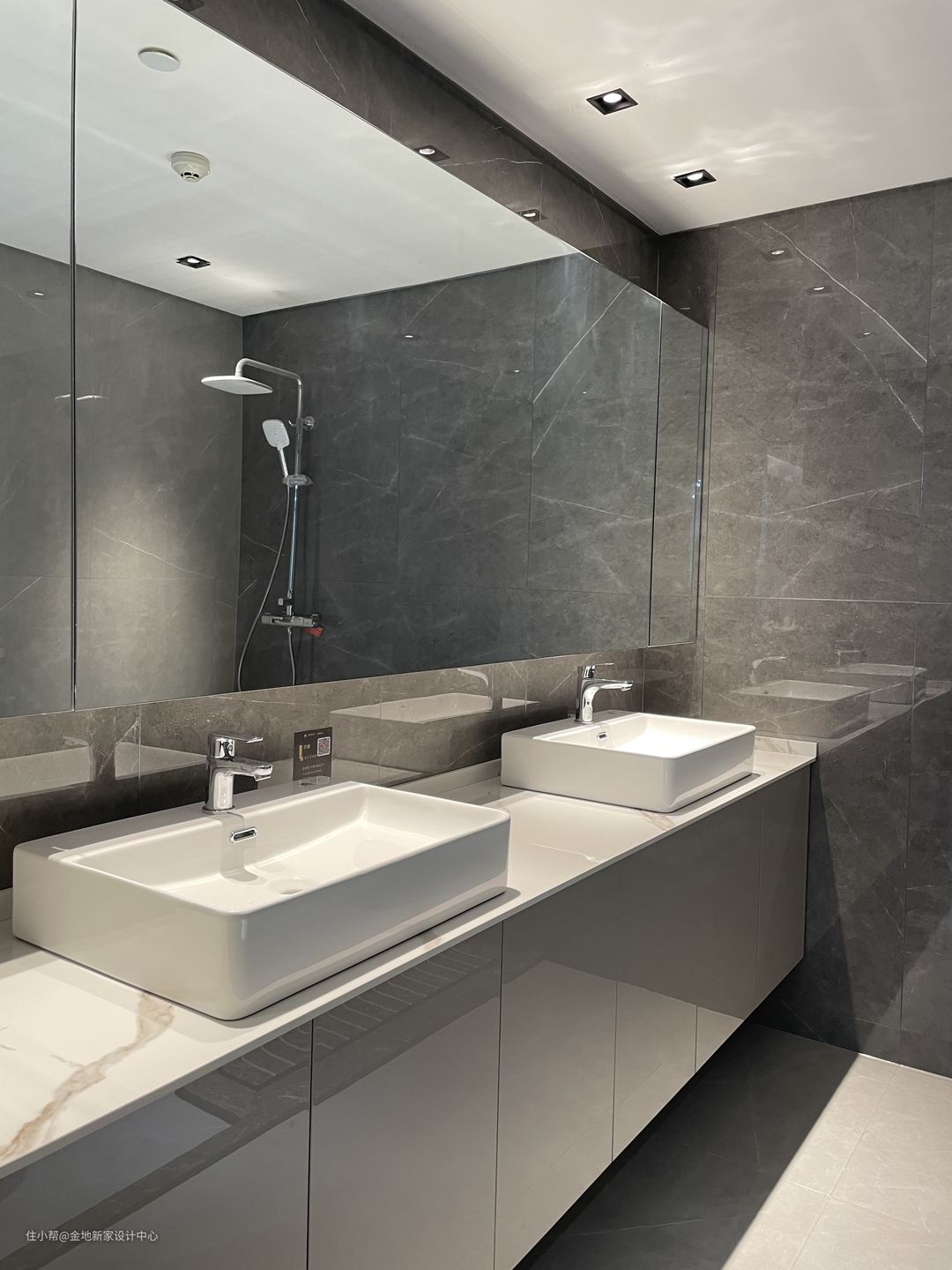 卫生间做双盆,干湿分离处理,干湿区域玻璃做玻璃隔断,增强整体延伸感。